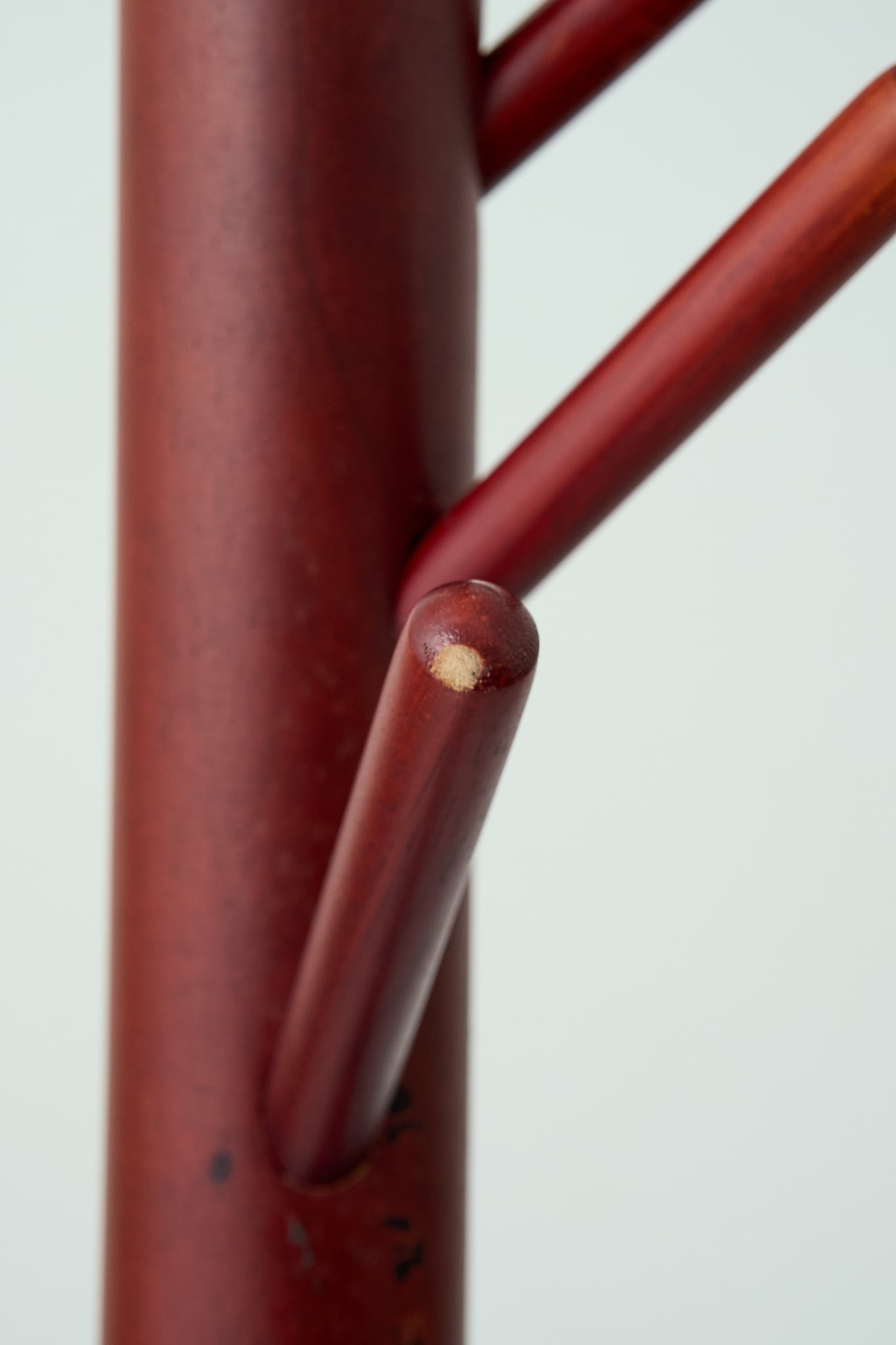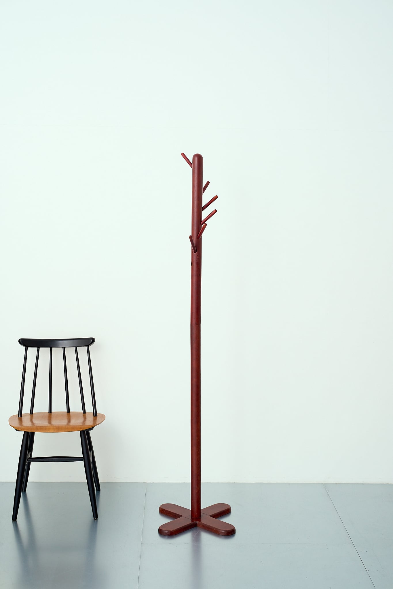 色味はエンジ色に近しい様に感じます。部屋の景観を損なう事のないグッドデザインのコートハンガーです。