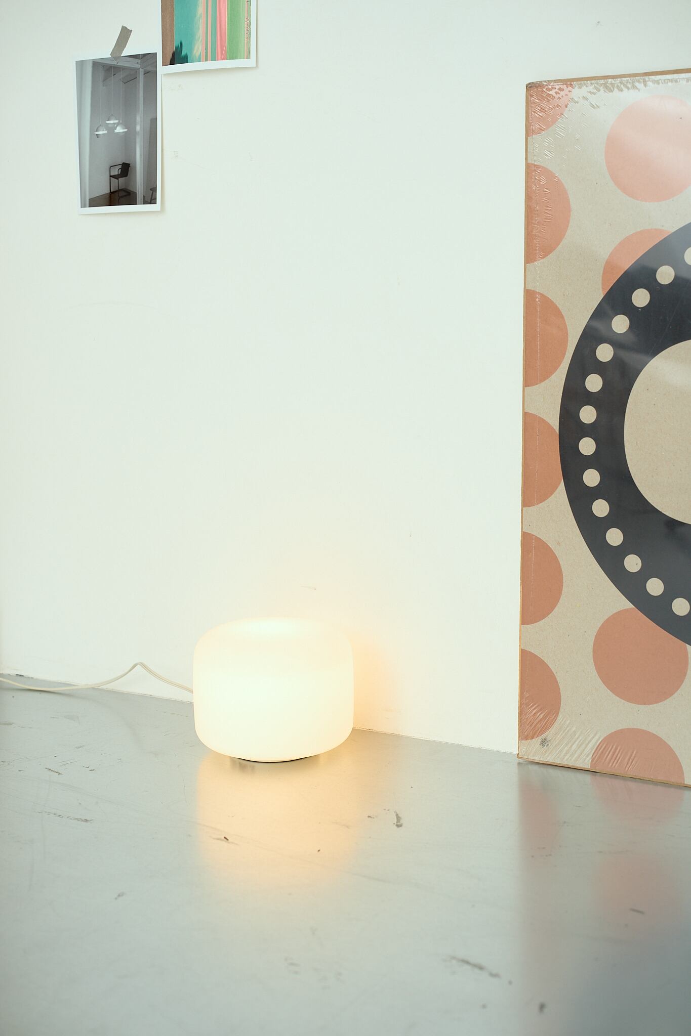 ふっくらしたフロストガラスが良い雰囲気のフロアライトです。床に直置きしたり、スツールの上に置いたりと、どこに置いても下から優しく照らしてくれます。