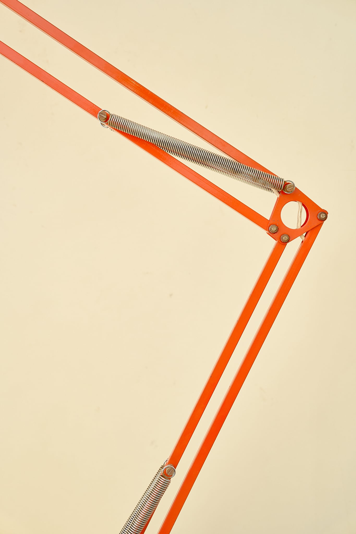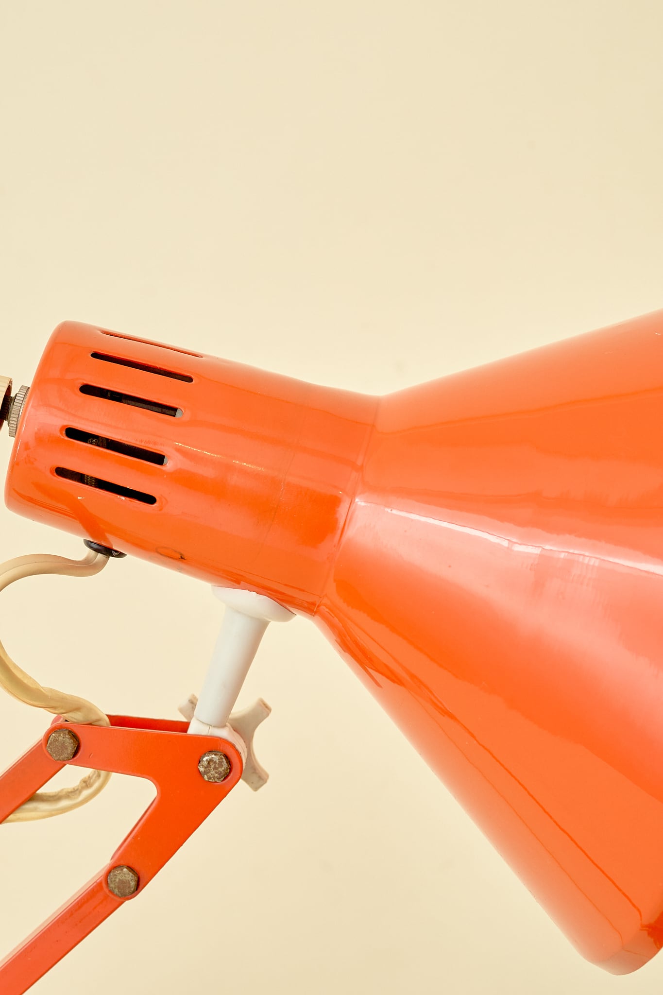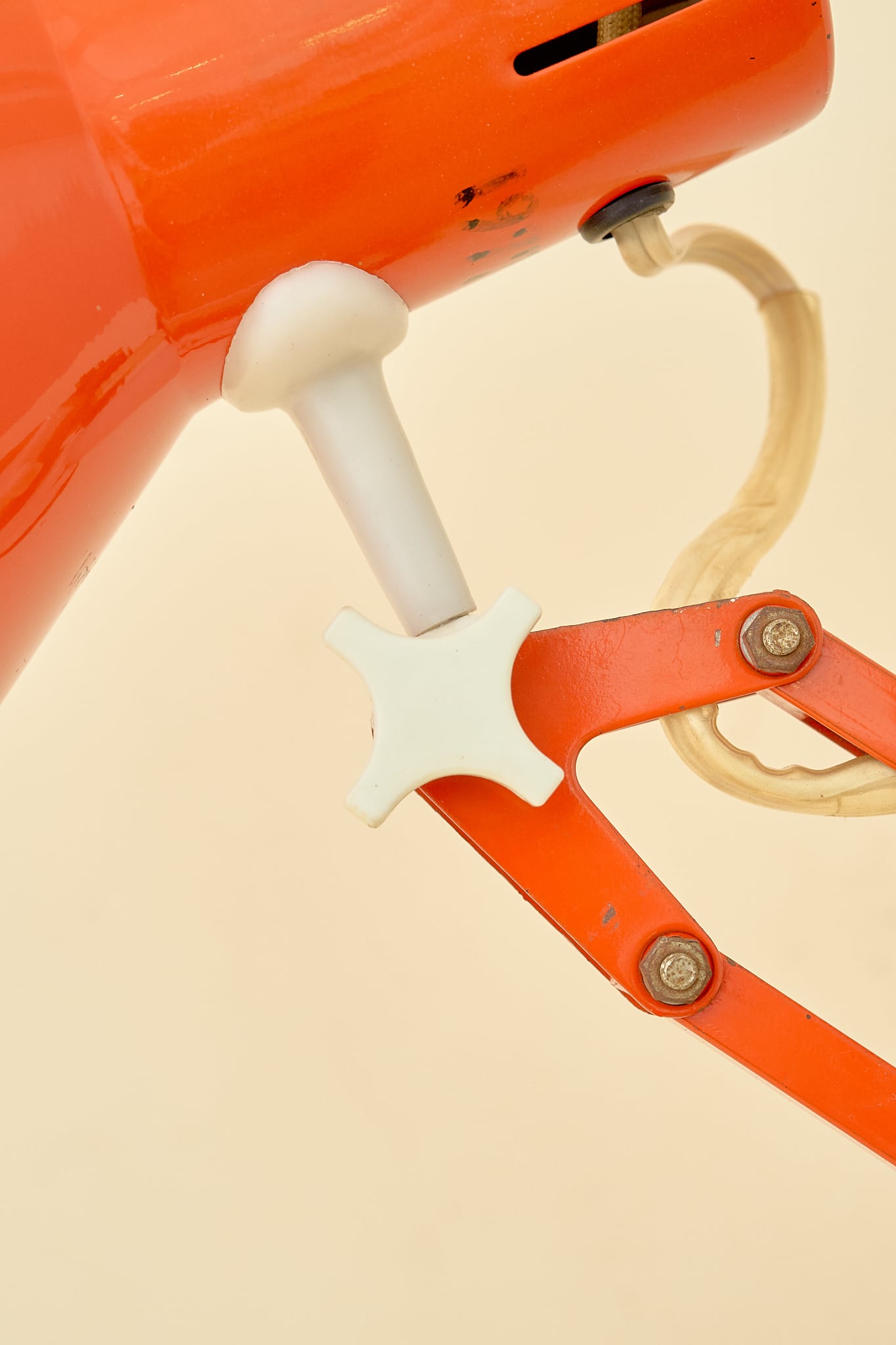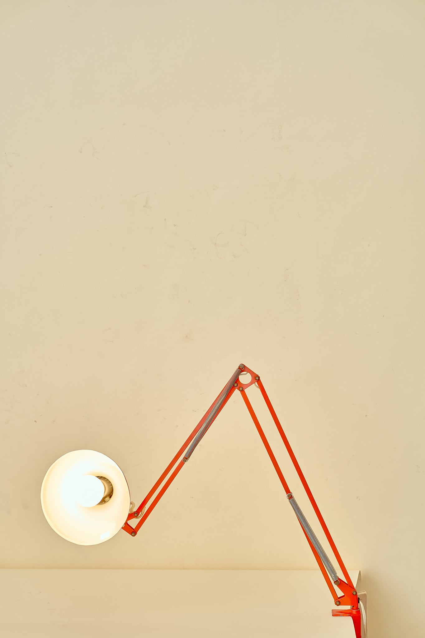 工業的でありながらもどこか遊び心を感じられる製品です。目を引く鮮やかなオレンジ色のシェードと、同様にオレンジ色で統一されたスリムな二股アームが大きな特徴と言えるでしょう。またアーム中部には「⚪︎」を思わせる装飾、さらにヘッドの角度を調整するノブは「×」にも見える視覚的なデザインがユーモラスです。