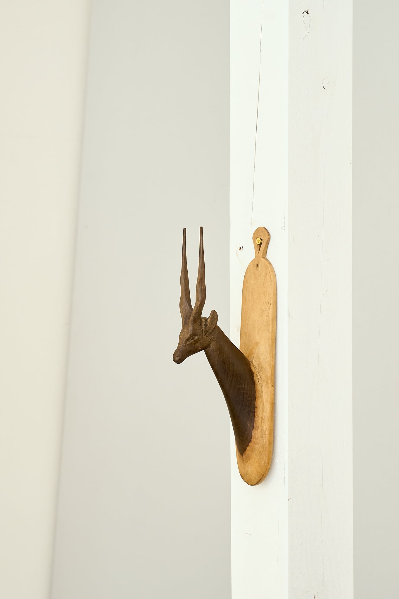 アフリカの出自と考えられますが、特有の温かみのある木材の風合いが、空間に穏やかさと自然な魅力を加えます。1本の木から掘りだされているようですが、ベースの白木部分と、ガゼルの褐色の木肌のコントラストが特徴です。シンプルながらも存在感があり、リビングや書斎、玄関など、どんな空間にも自然に溶け込み、見る人の目を引くアクセントとなるでしょう。