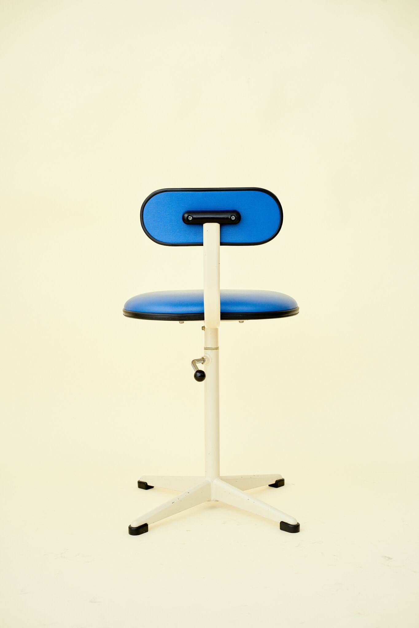 シンプルなフォルムながらも、ブルーとアイボリーのコントラストが空間にポップでレトロな印象を与えます。オフィスだけでなく、ご自宅の書斎や子供部屋、また店舗のアクセントとしても良いデザインです。今回は2脚まとめて入荷していますが、どちらも座面・背面のウレタンや合皮に破れやヤケもなく非常に状態は良好です。