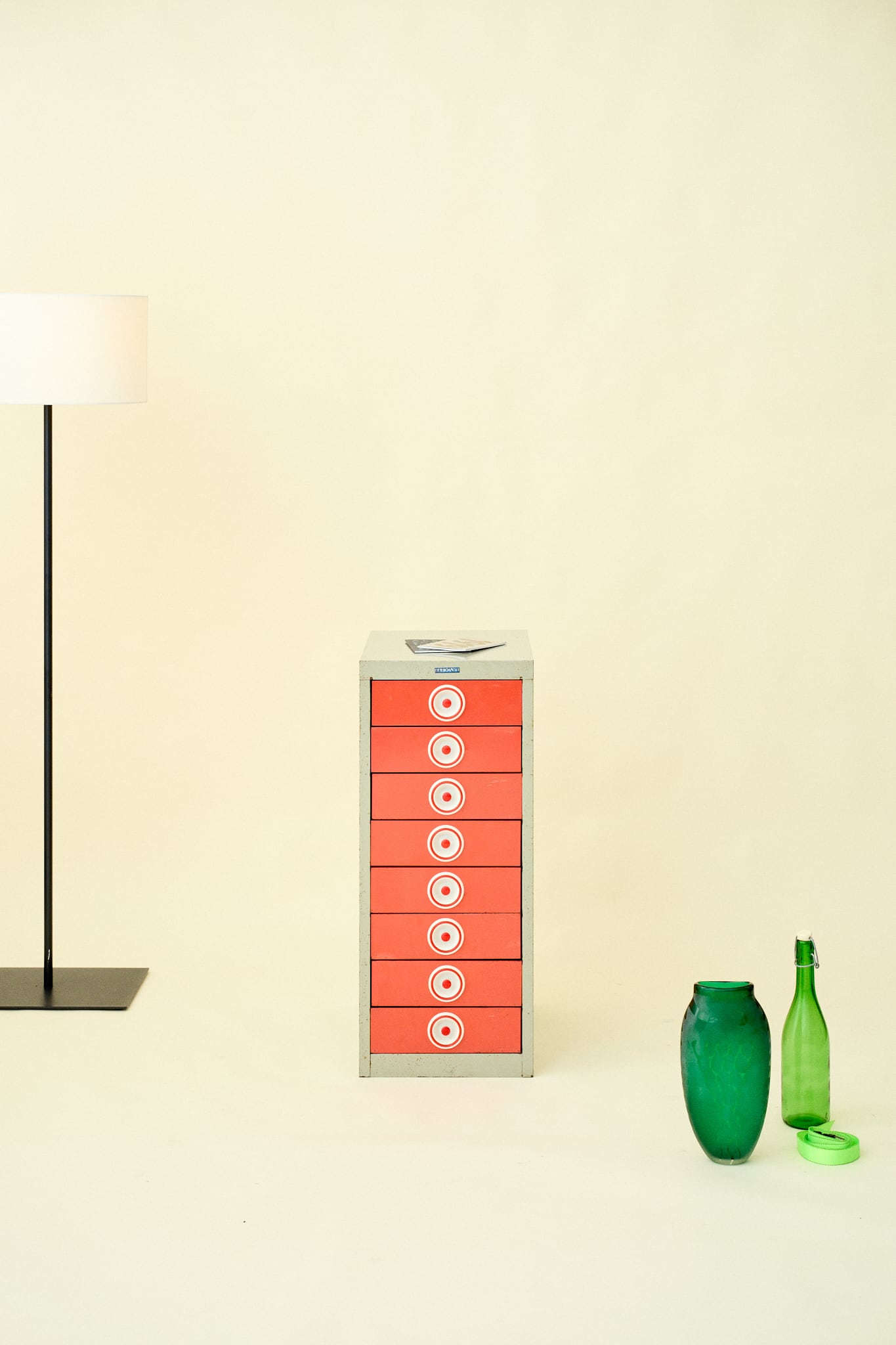 ポップな色彩と実用性を兼ね備えた、スチール製8段ドロワーキャビネットです。全体のグレーの本体に対し、引き出し部分の鮮やかな赤色が印象的で、部屋の中でもアクセントになるでしょう。