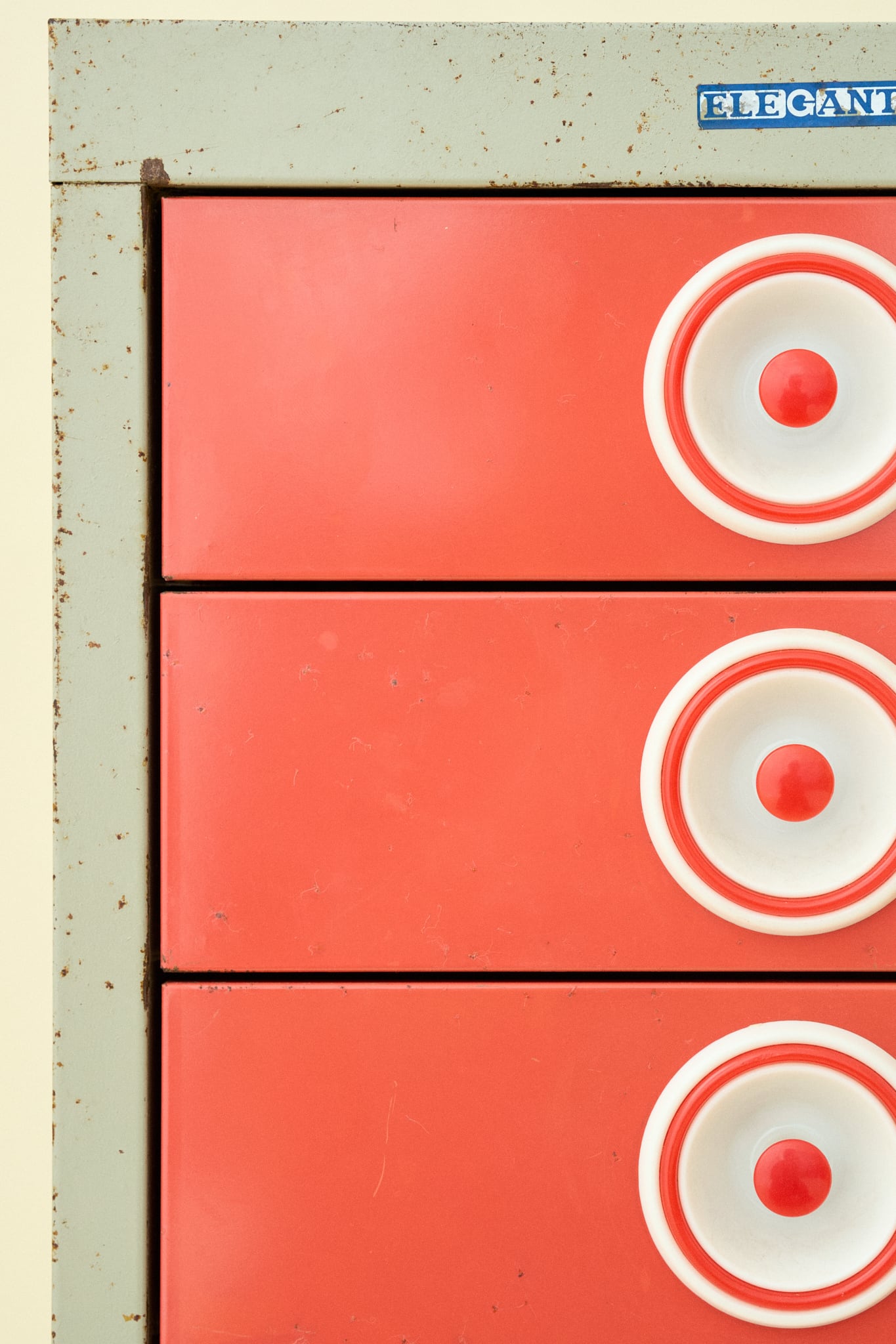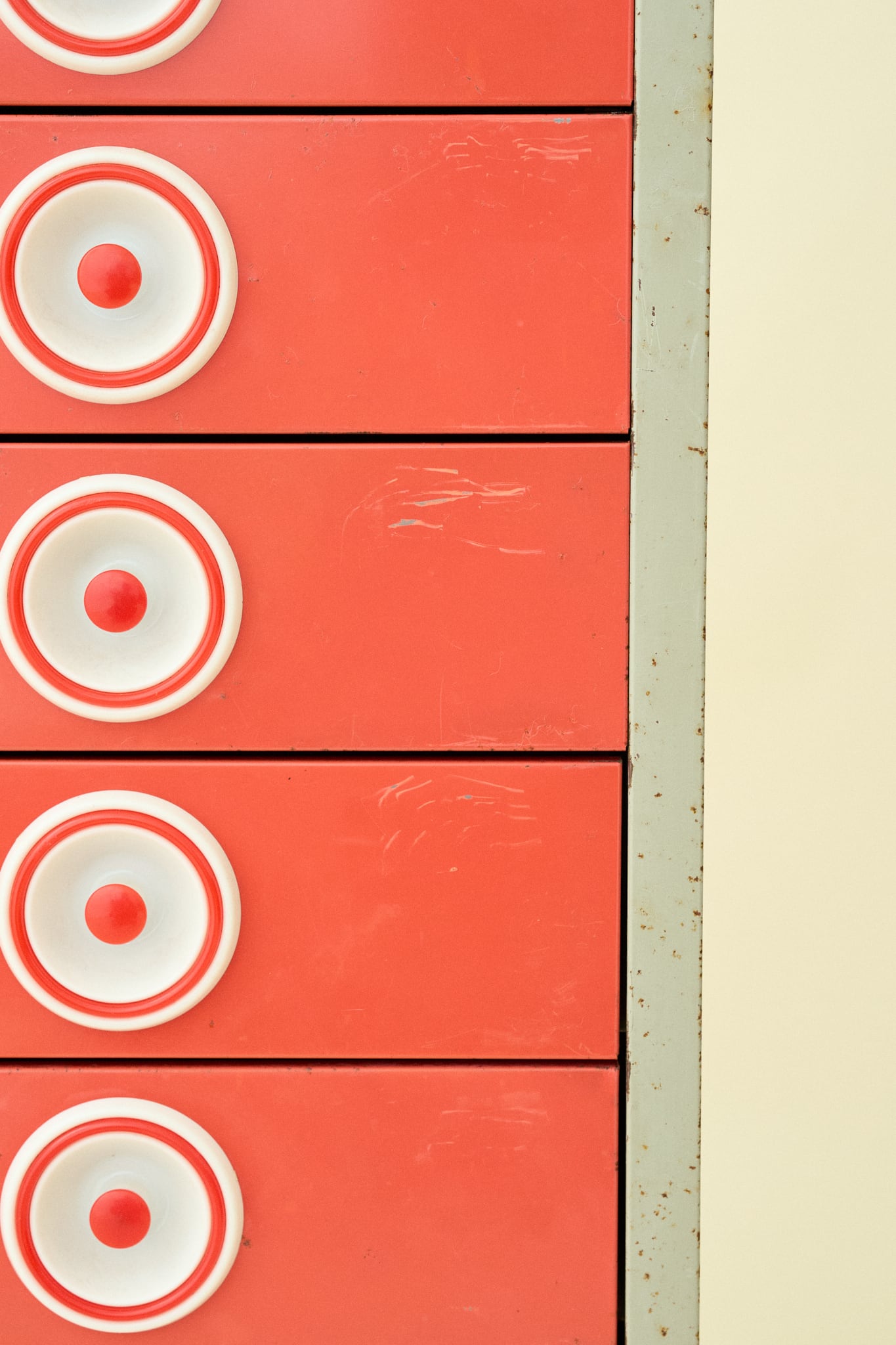 各引き出しには、中心の赤い丸から白い二重の円がまるでレコードの盤面やターゲットマークのようなユニークなデザインの取っ手が付いています。