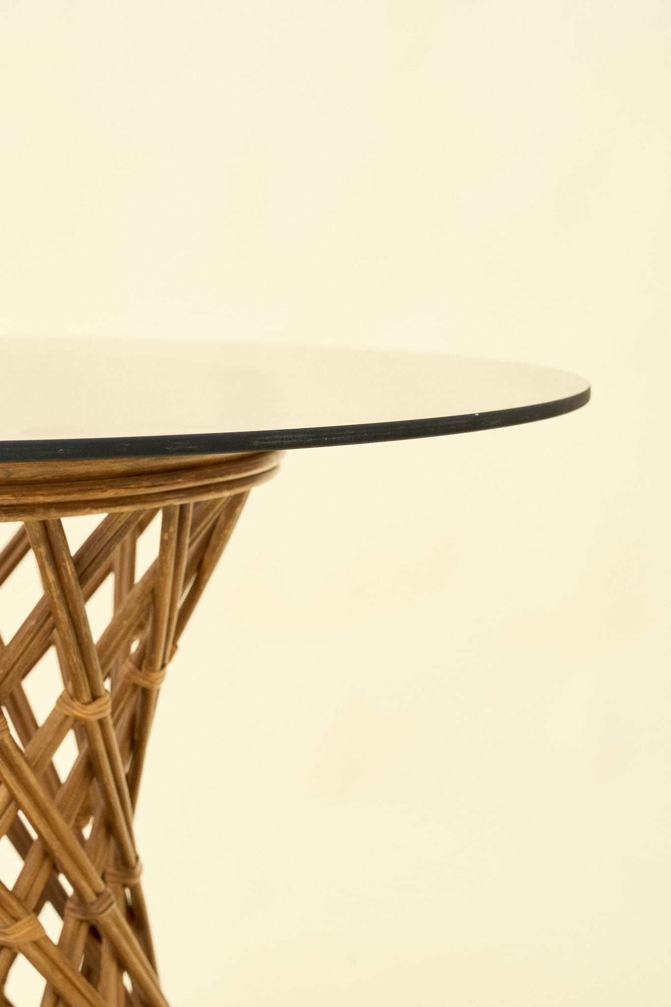 ラタンの曲線美と、スモークがかったアンバー色のガラス天板が特徴の円形テーブルです。