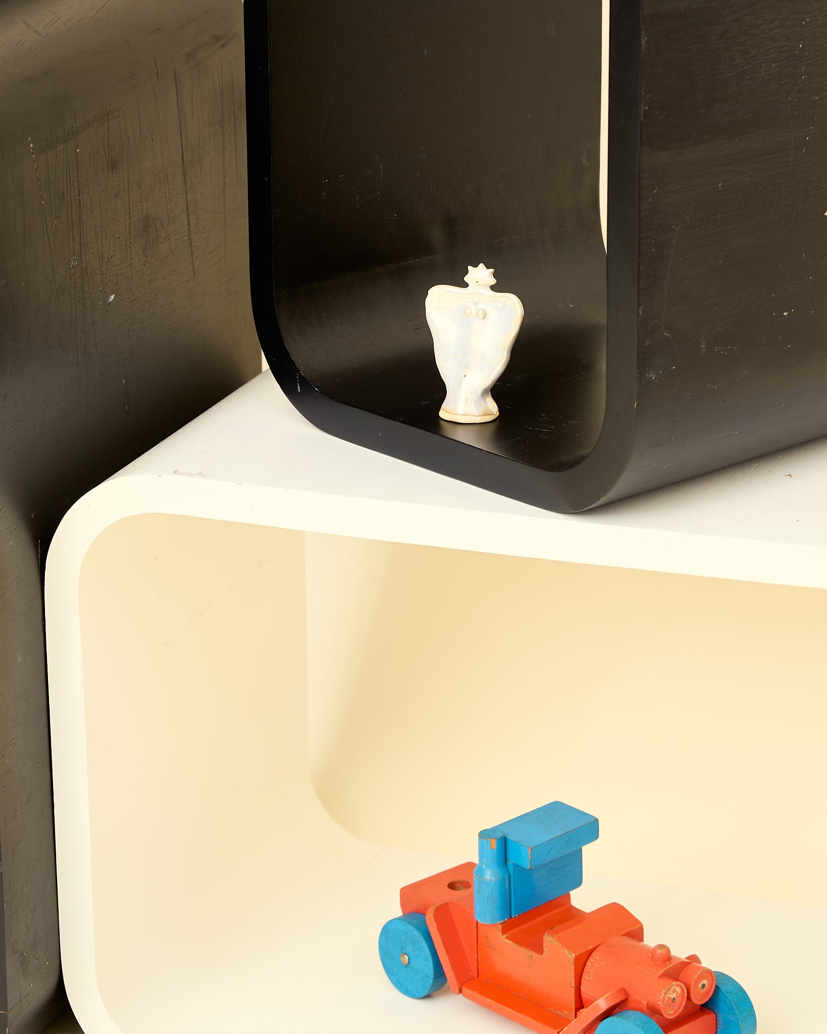 BOOM社製”METRO CUBE SHELF”です。ブラックとホワイトの6個セットです。モジュール型のデザインで、縦横自由に組み合わせが可能。棚としてはもちろん、サイドテーブルやディスプレイ什器など、多用途にお使いいただけます。入れ子式にスタッキングできるため、未使用時も省スペースで収納可能です。