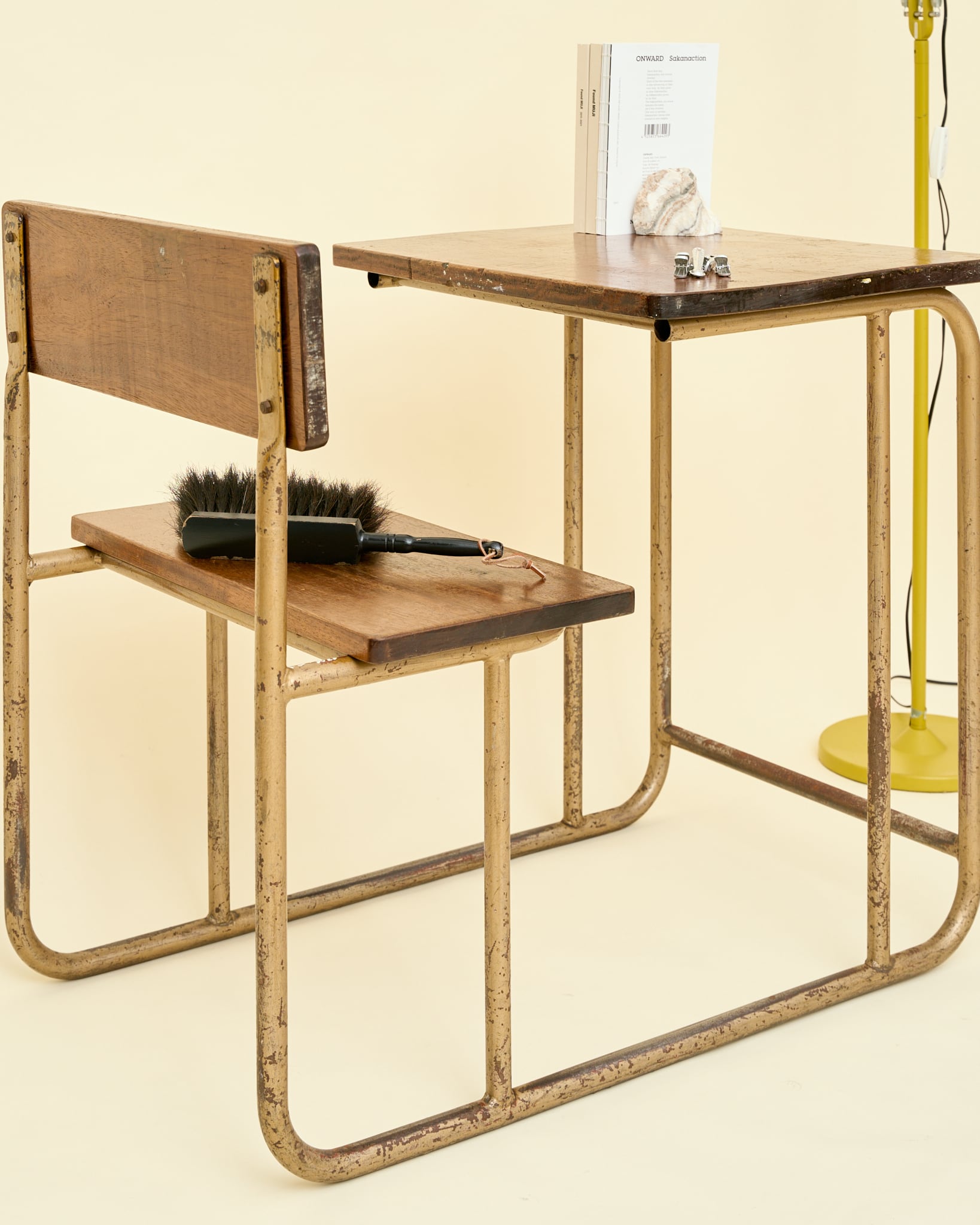 スチールパイプ製のフレームに木製の天板・座面を備えたシンプルな構造のデスク&チェアです。イギリスやオランダなど、海外の小学校などで使用される学習机だと思われます。天板、座面には無垢の木材(ラワン材に似た素材)が使用されていて、パイプは黄色を感じる色味です。デスクとチェアが一体になっているデザインが特徴です。