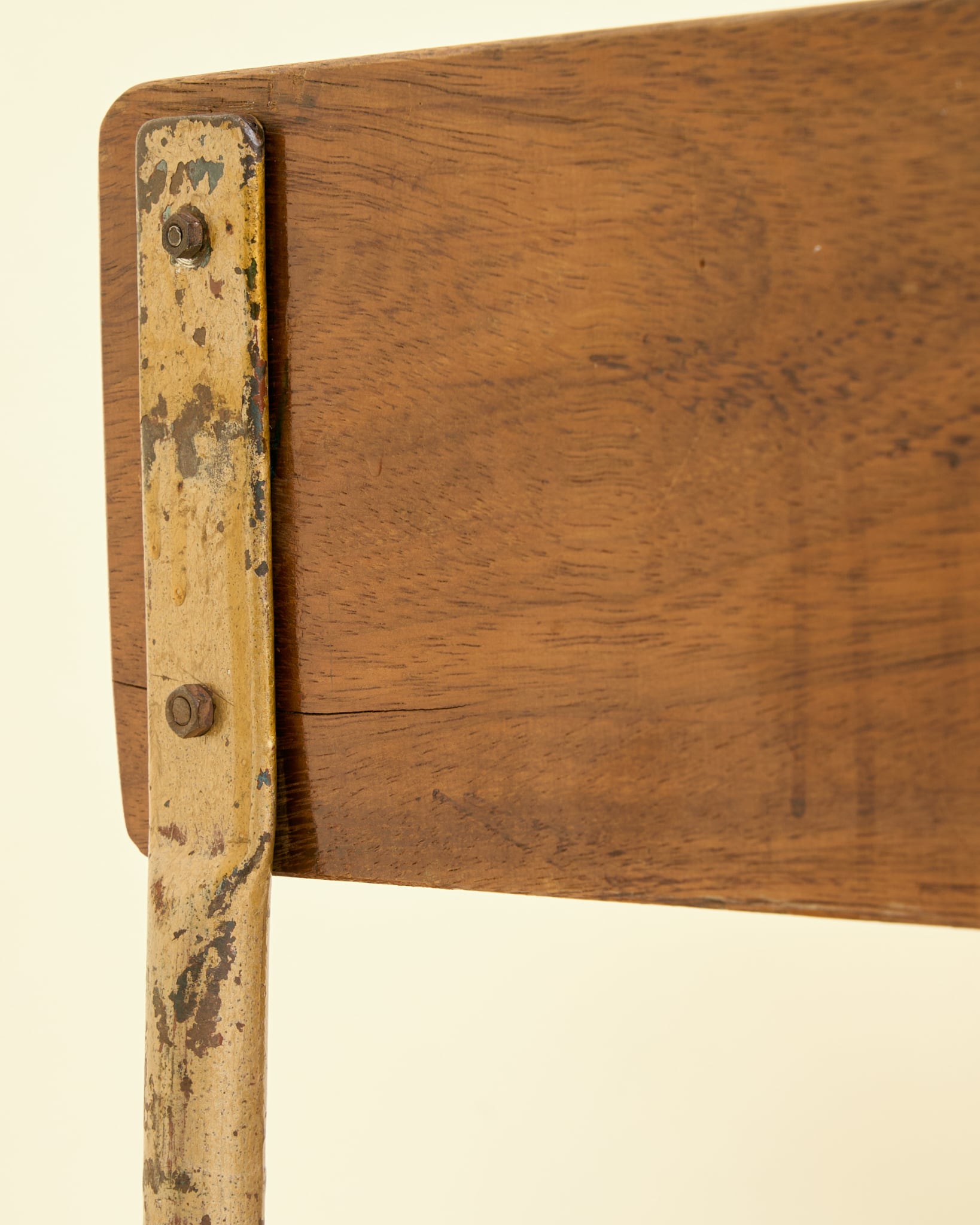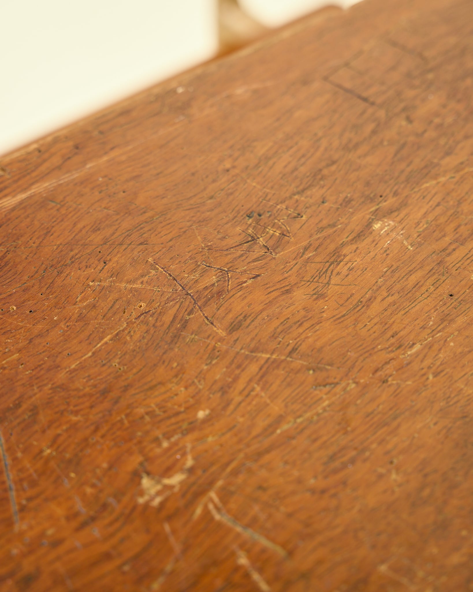 製造された年月は不明ですが、使用されているビスや天板の風合い、パイプの経年を鑑みると1960年代付近の個体なのではと予想しています。長年の使用によりフレームには塗装剥がれやサビ、木部には傷や使用痕、生徒が書き込んだと思われる落書きが見られますが、良き風合いとして受け入れられるものであると感じます。