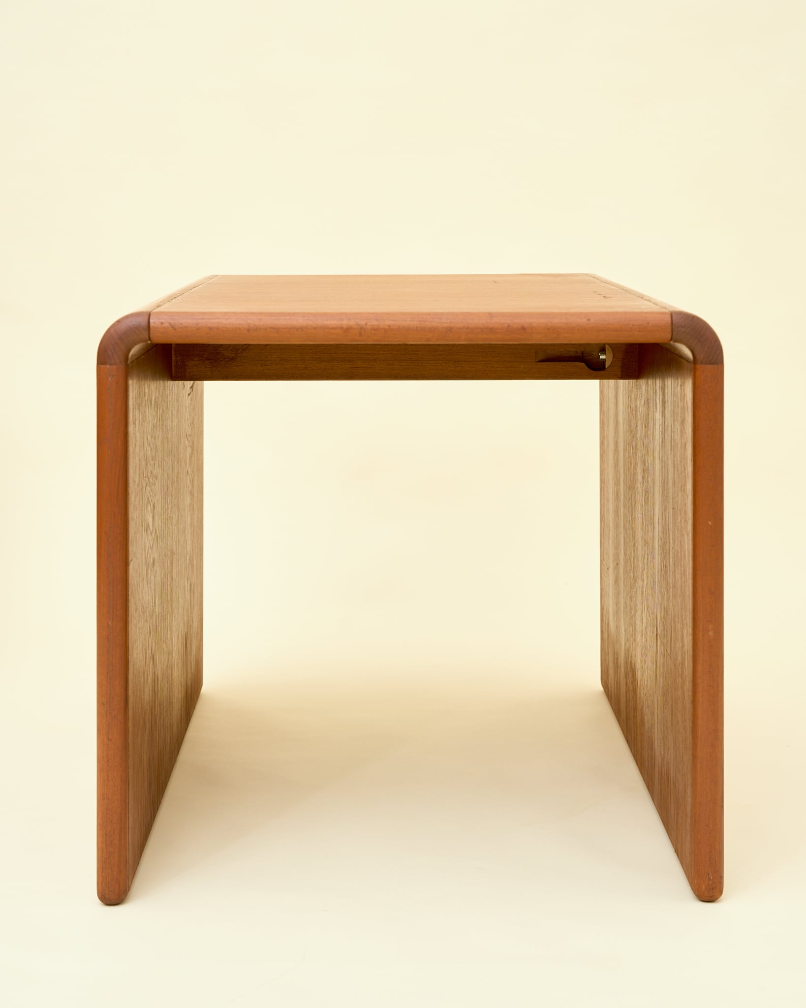 天板と側板はチークの突板で、その二つを接合しているパーツには無垢の木が使用されており、手触り良い形状に削り出されています。この部分の色が深く、視覚的にも良いアクセントになっています。コの字型のテーブルなので、見せたくないものはカゴなどを使って中に収納できますし、壁際でコンソールのような使い方にも適しています。