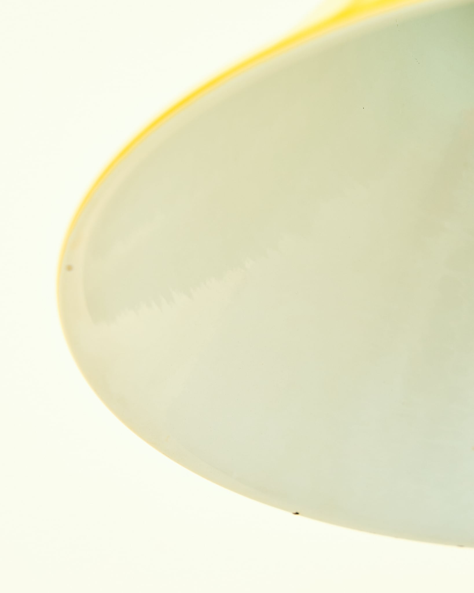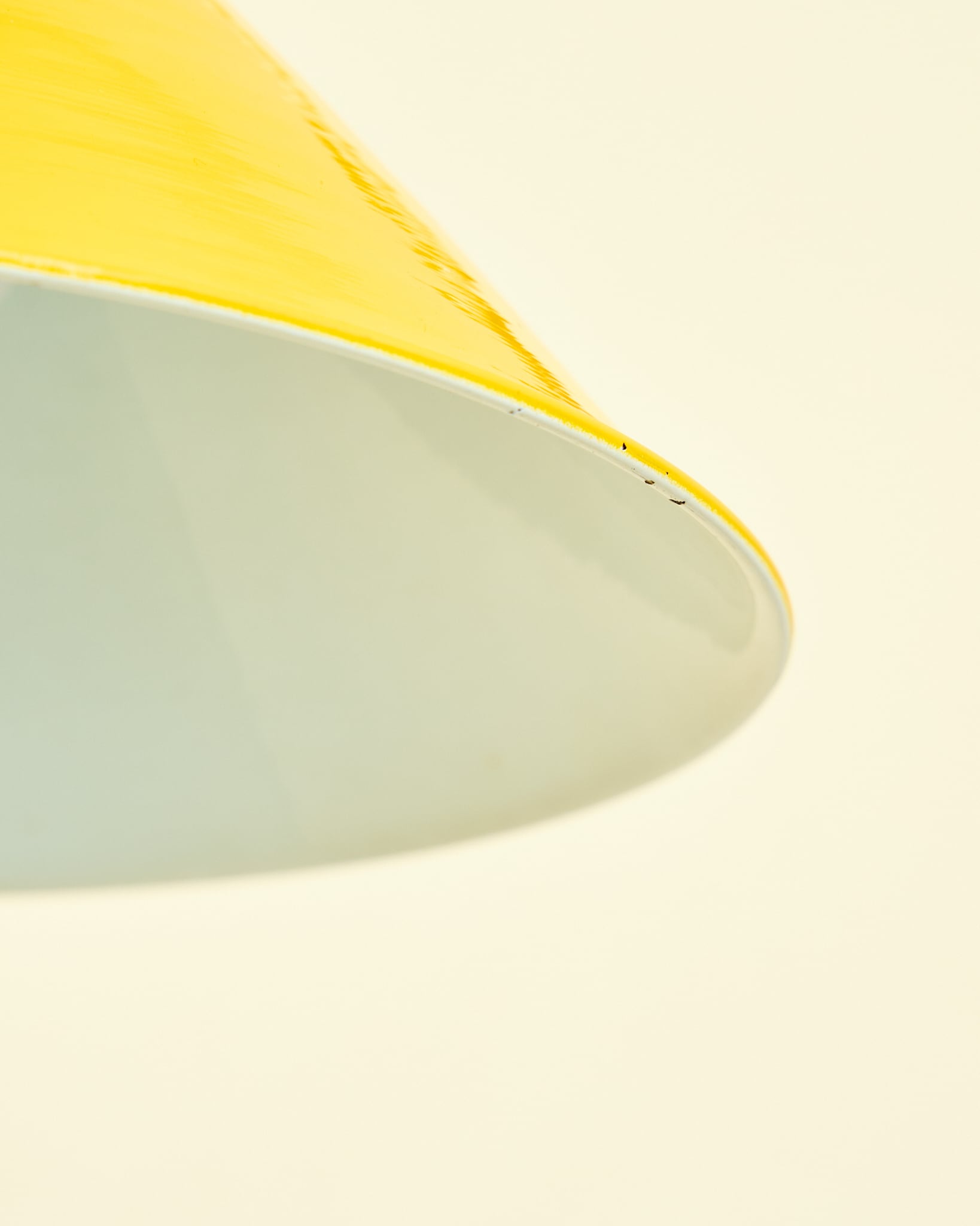 鮮やかな琺瑯製のイエローのシェードと、ビビッドなブルーコードの組み合わせが印象的な小ぶりなペンダントライトです。シンプルな円錐フォルムながら、ポップなカラーリングが空間のアクセントになるでしょう。どこか北欧の雰囲気を纏う本商品ですが、恐らくは60年代頃の日本製のものと思われます。