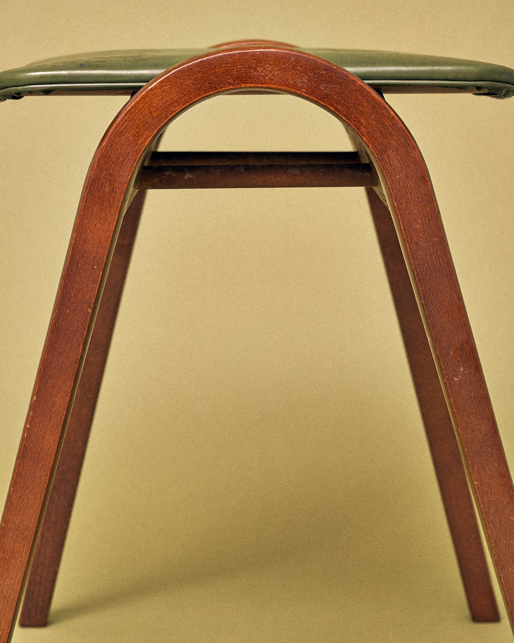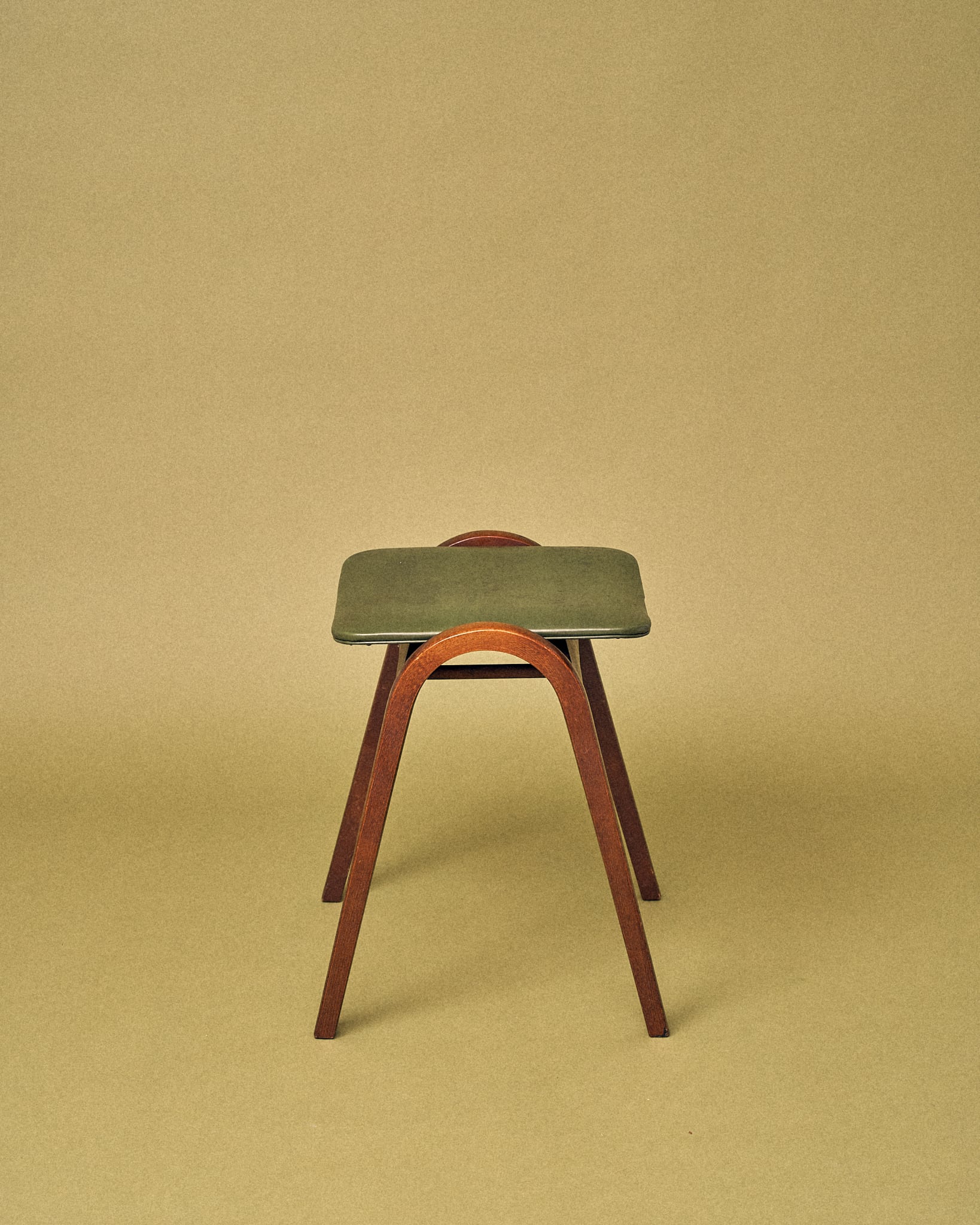 秋田木工のNo.202スツールです。今回は座面が オリーブグリーンでフレームはコゲ茶色のものです。