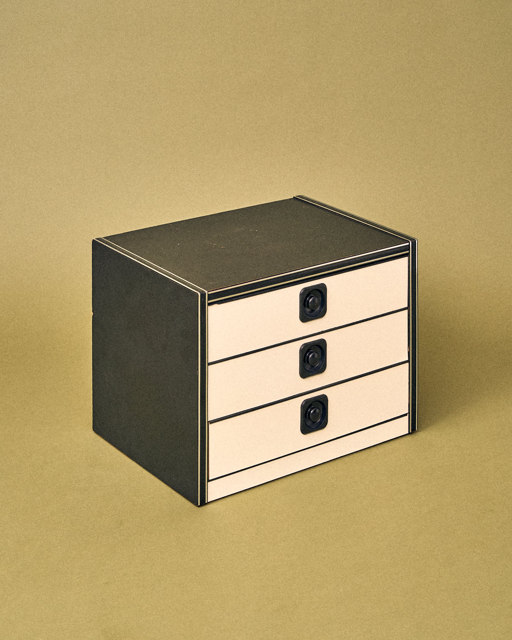 白と黒のコントラストと、取っ手の形状にスペースエイジの雰囲気を纏うキャビネットです。