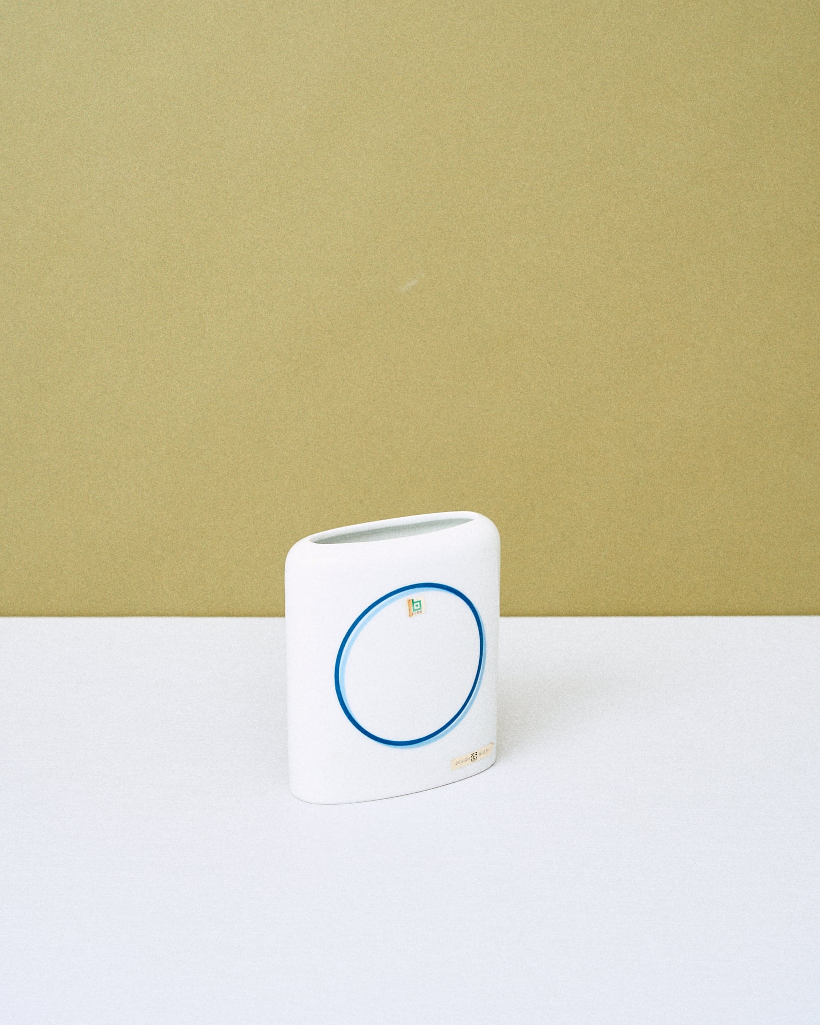 白山陶器の花瓶です。濃淡2色の円が描かれたグラフィックが印象的で、デザインは森正洋氏によるものです。同氏は50年代中頃に白山陶器へ入社し、インハウスデザイナーとして20年活躍し、生涯にわたって同社のデザインに関わった人物です。