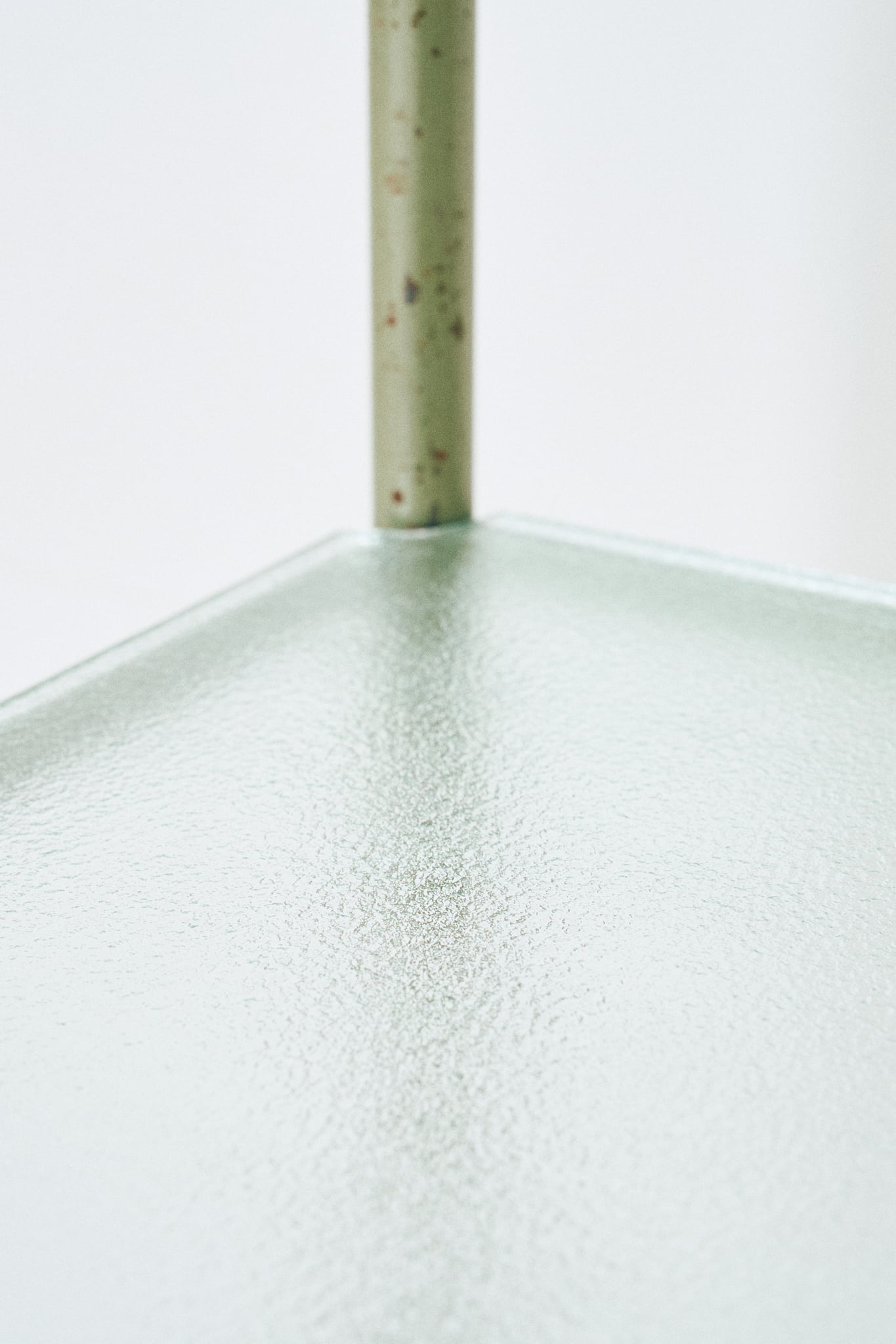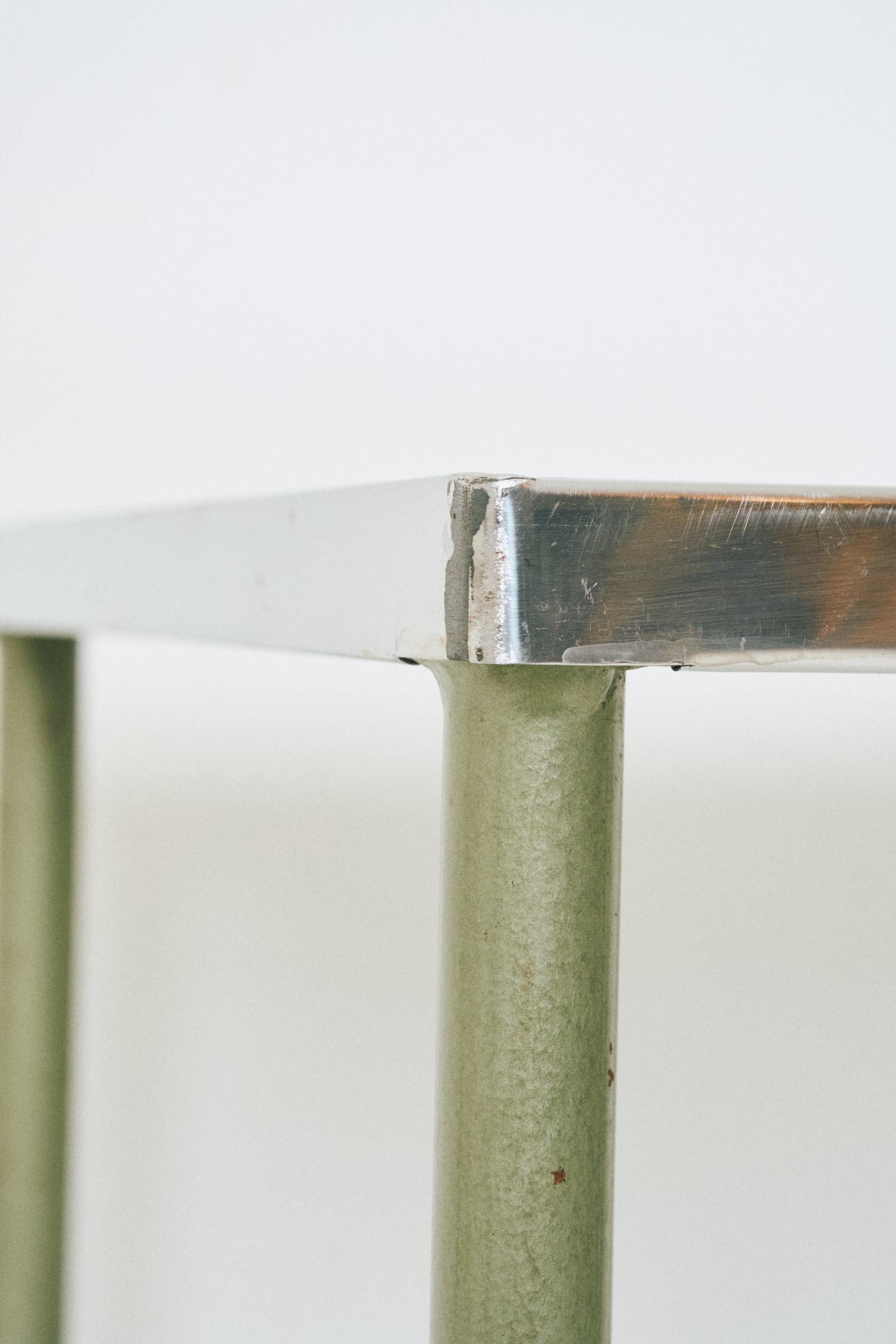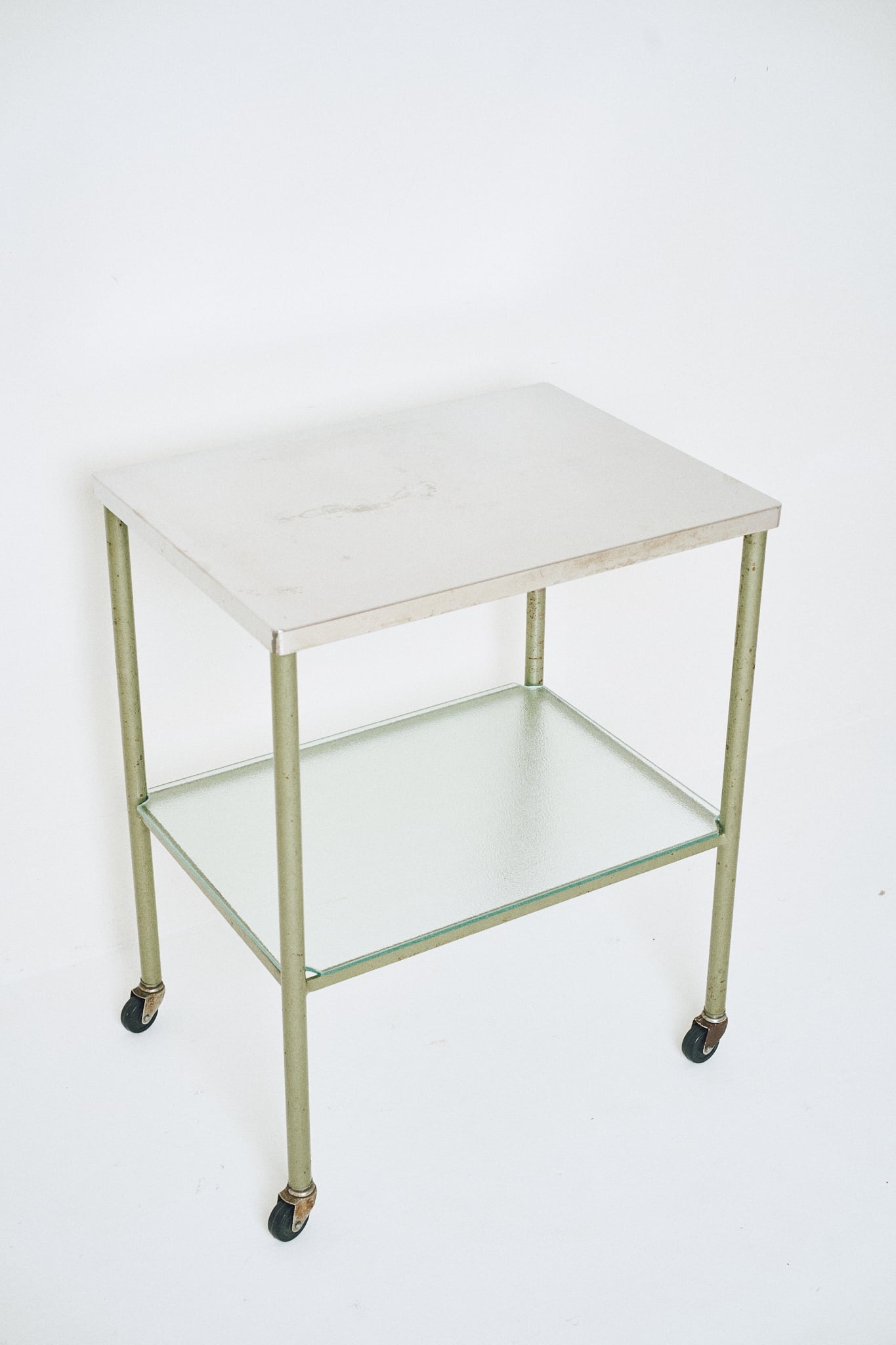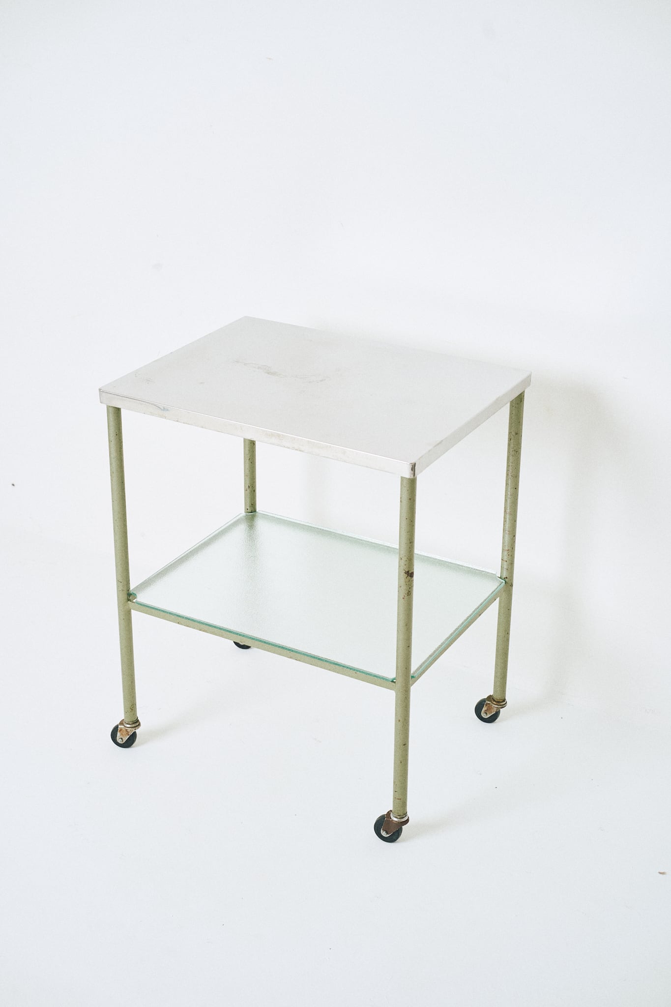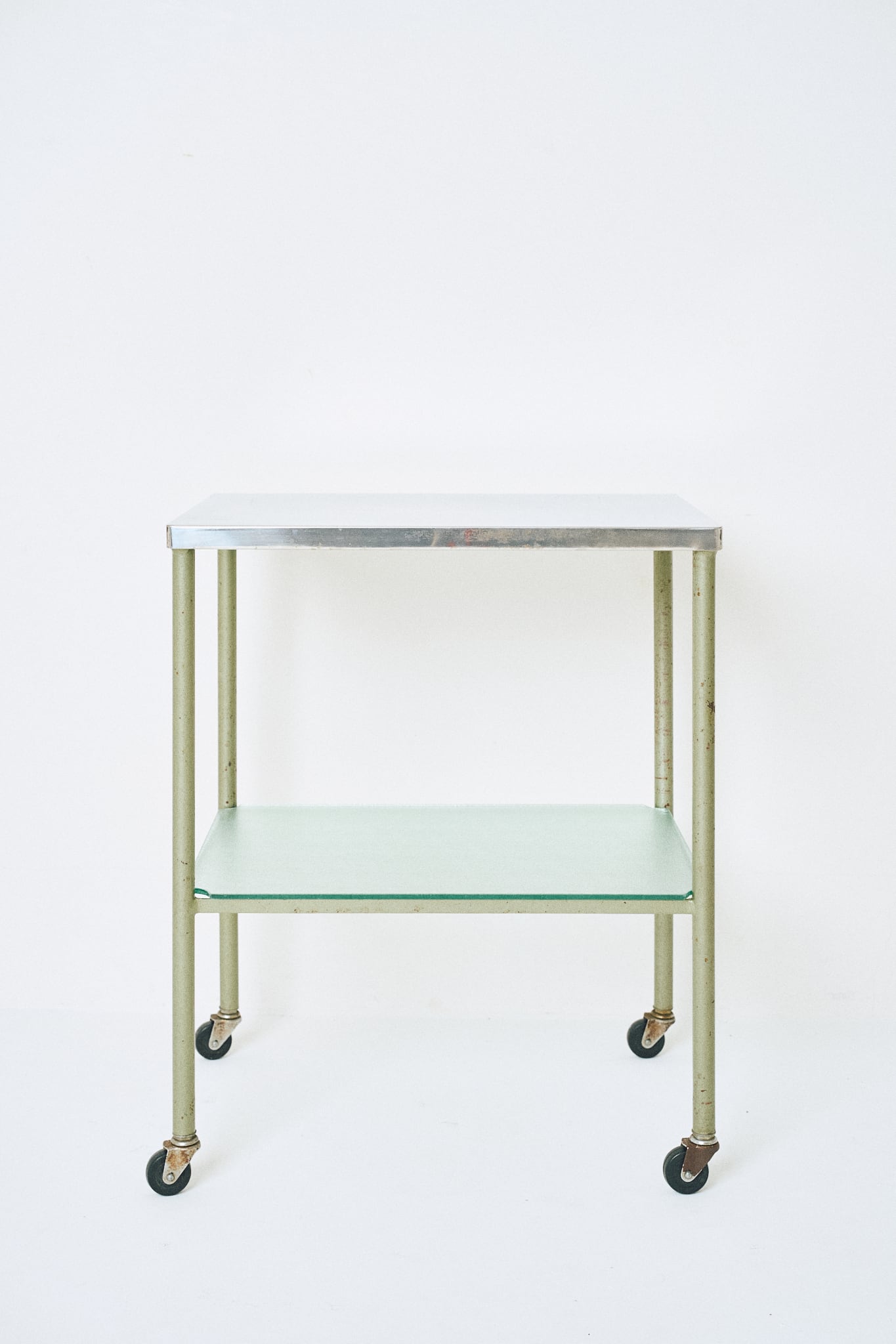 天板がステンレス製、中板にはガラスが使われたワゴンです。診療所などで使用されていたであろう医療用のワゴンであると考察されます。直線的なフォルムと、スレンレスとガラス、当時はよくあった緑がかったスチールとの組み合わせが特徴。そこに程よい経年の具合がアクセントになっています。