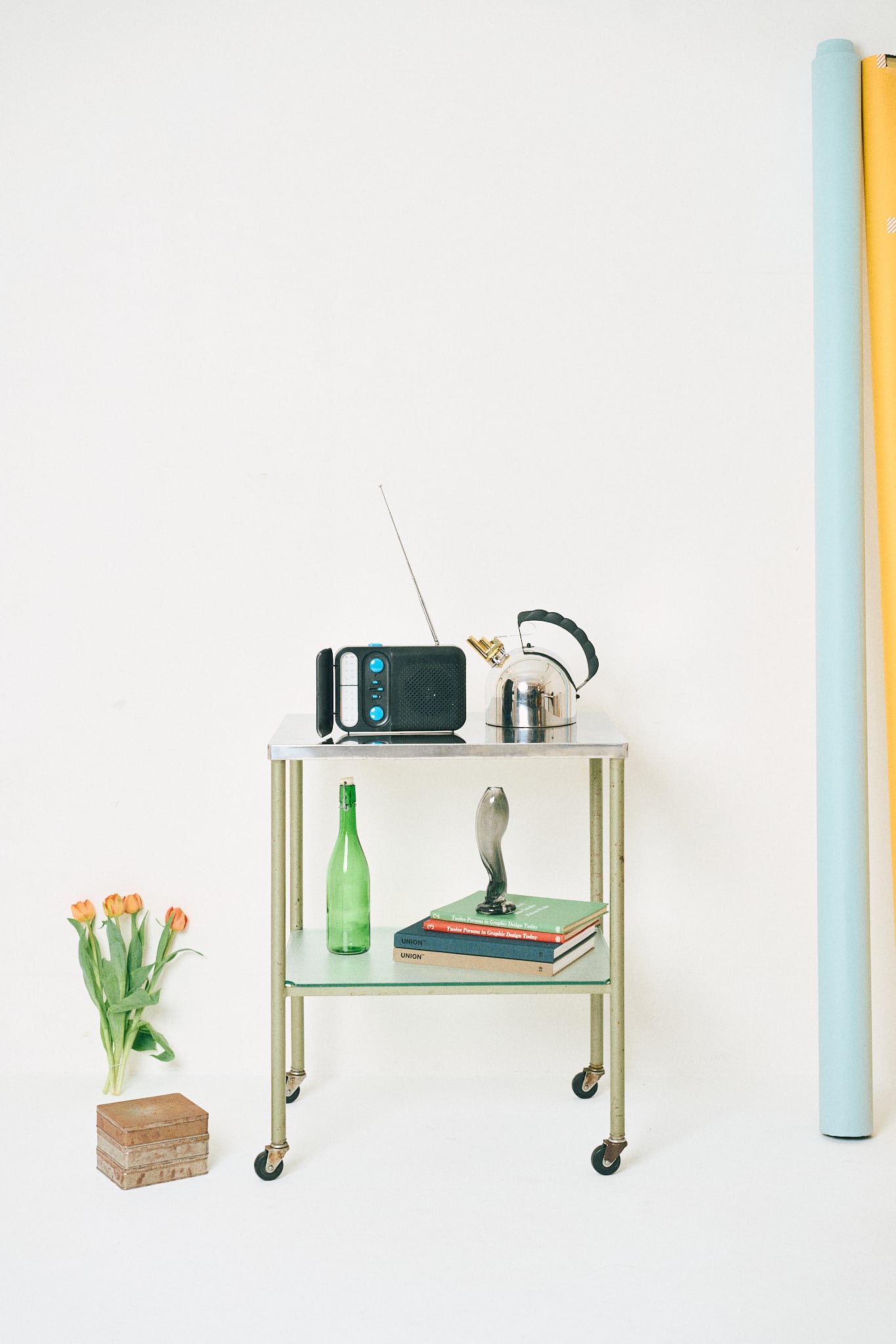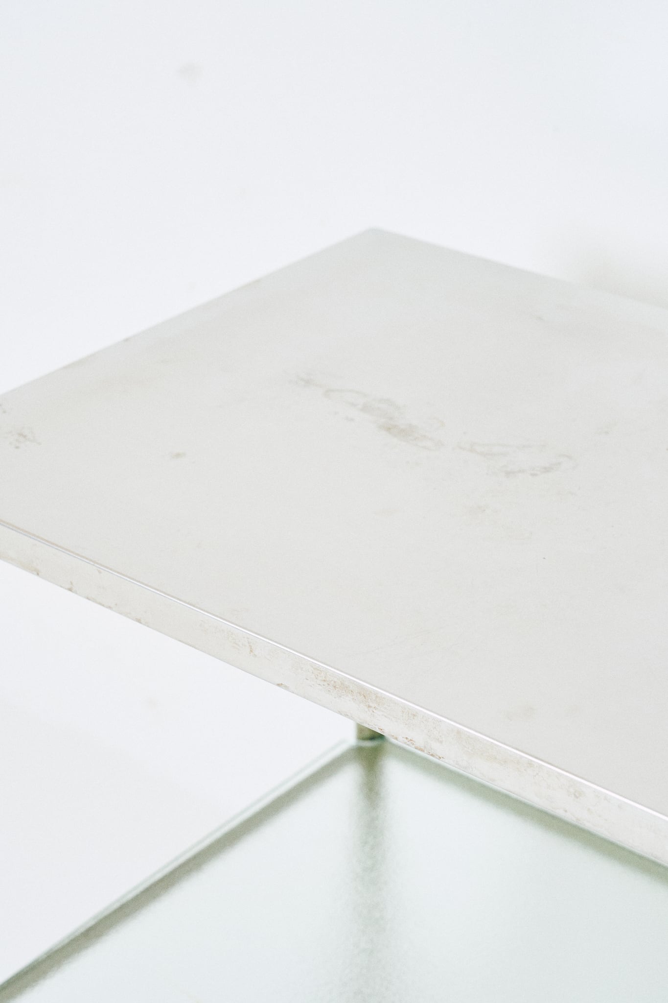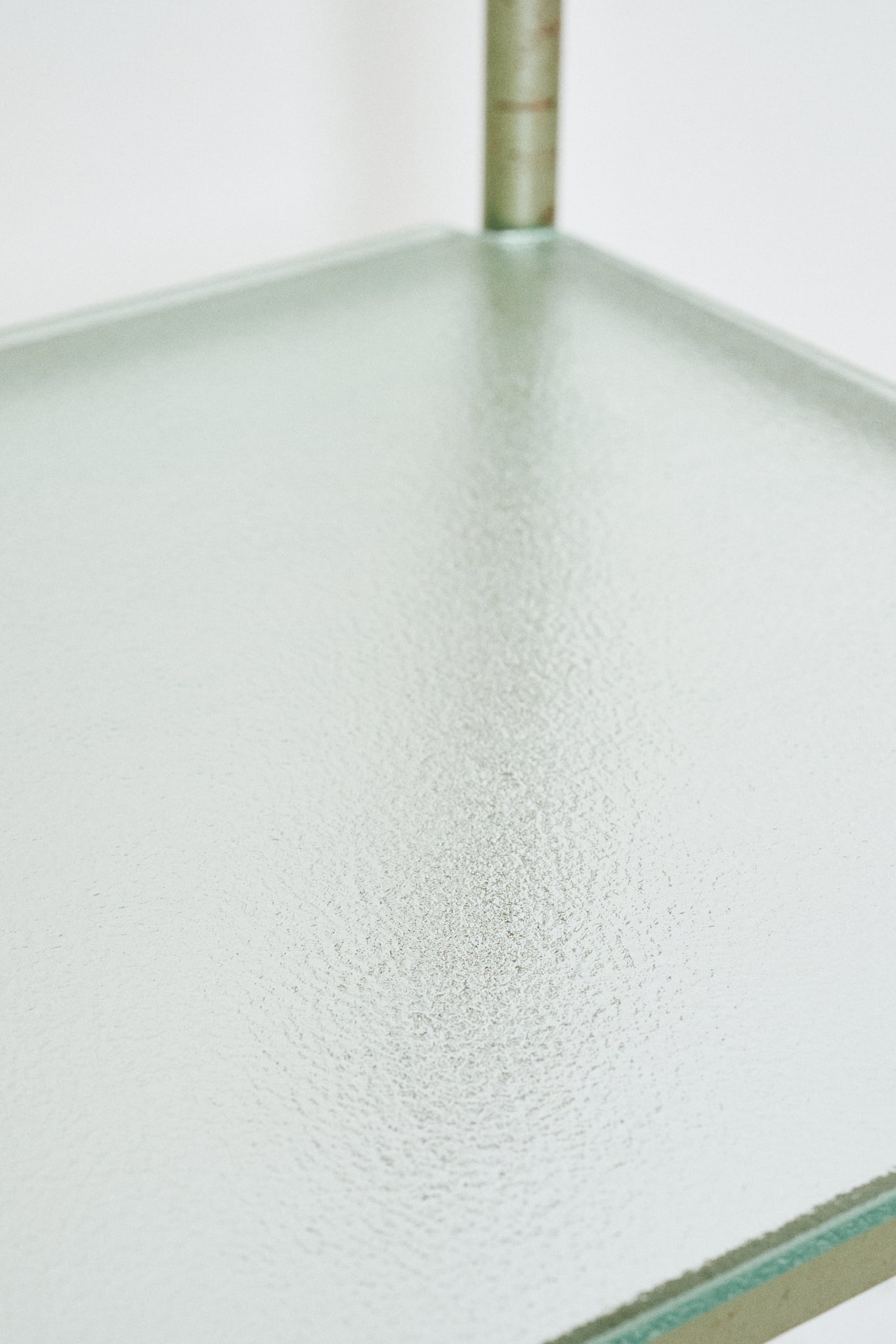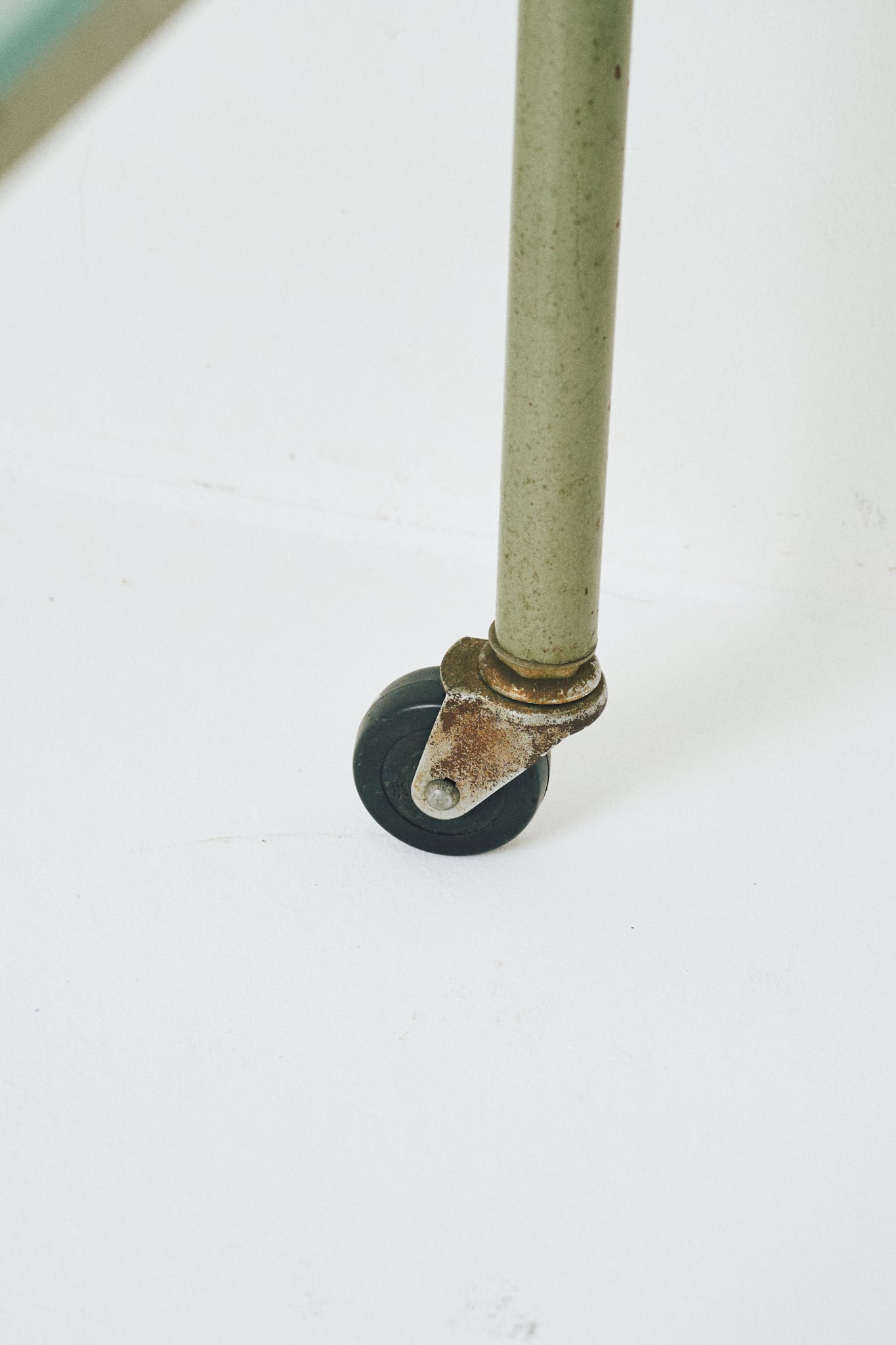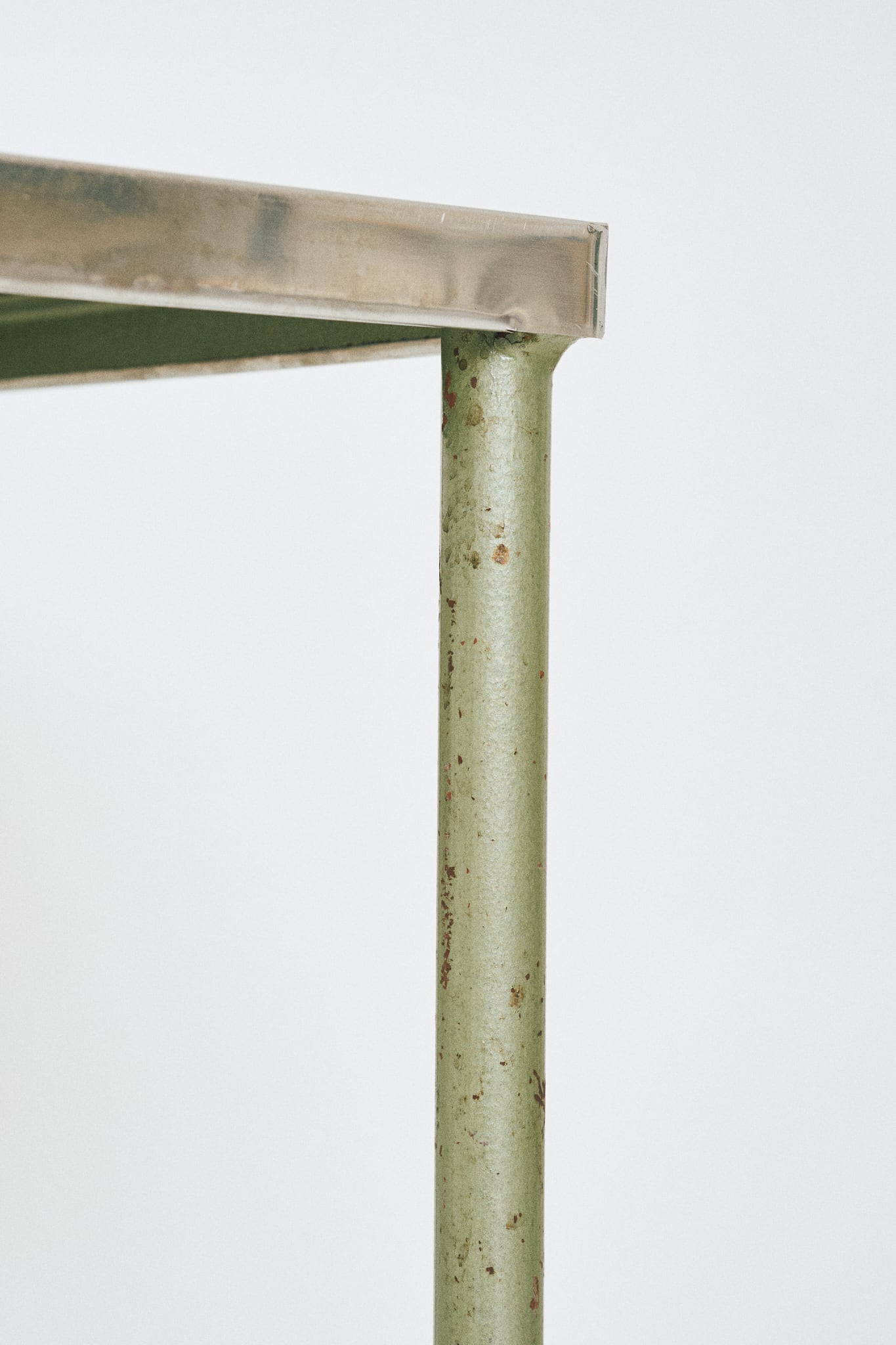 天板がステンレス製、中板にはガラスが使われたワゴンです。診療所などで使用されていたであろう医療用のワゴンであると考察されます。直線的なフォルムと、スレンレスとガラス、当時はよくあった緑がかったスチールとの組み合わせが特徴。そこに程よい経年の具合がアクセントになっています。