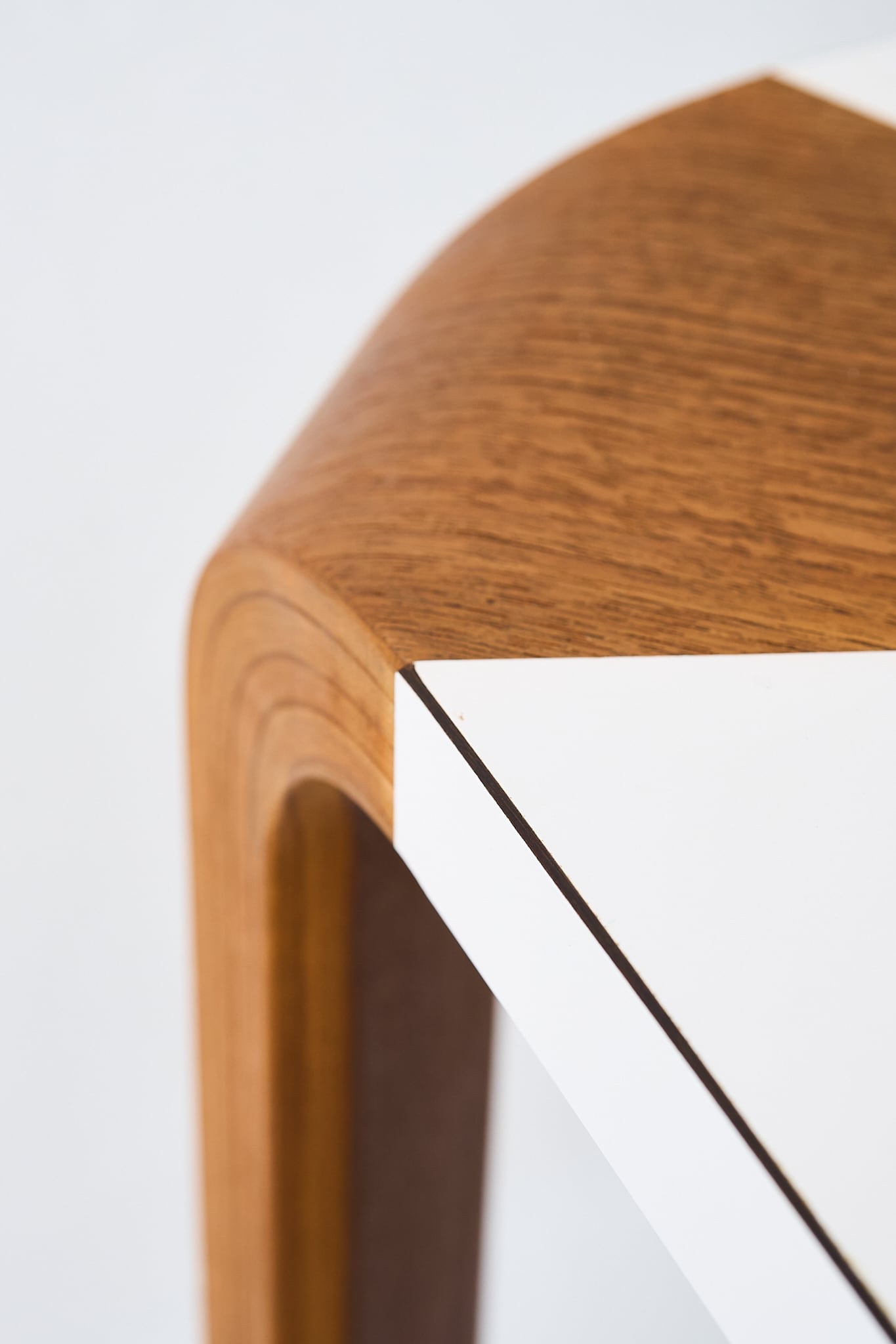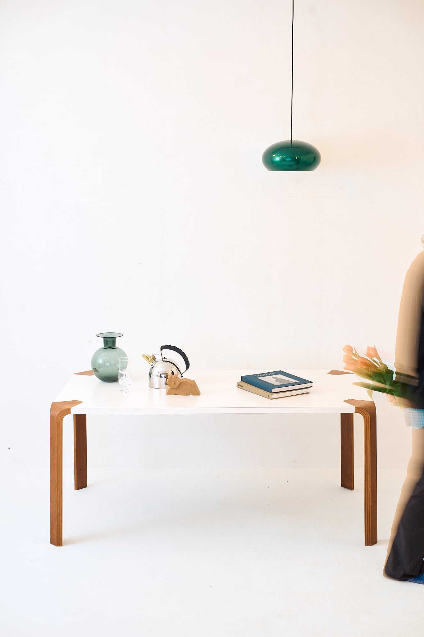 成形合板でつくられた脚を天板に直接つないでいるため、天板の四隅に角が無いのが特長です。非常にシンプルな構成で、4人がけのダイニングテーブルとは思えない軽さであることも魅力の一つです。女性一人でも問題なく移動させられるほどの重量です。