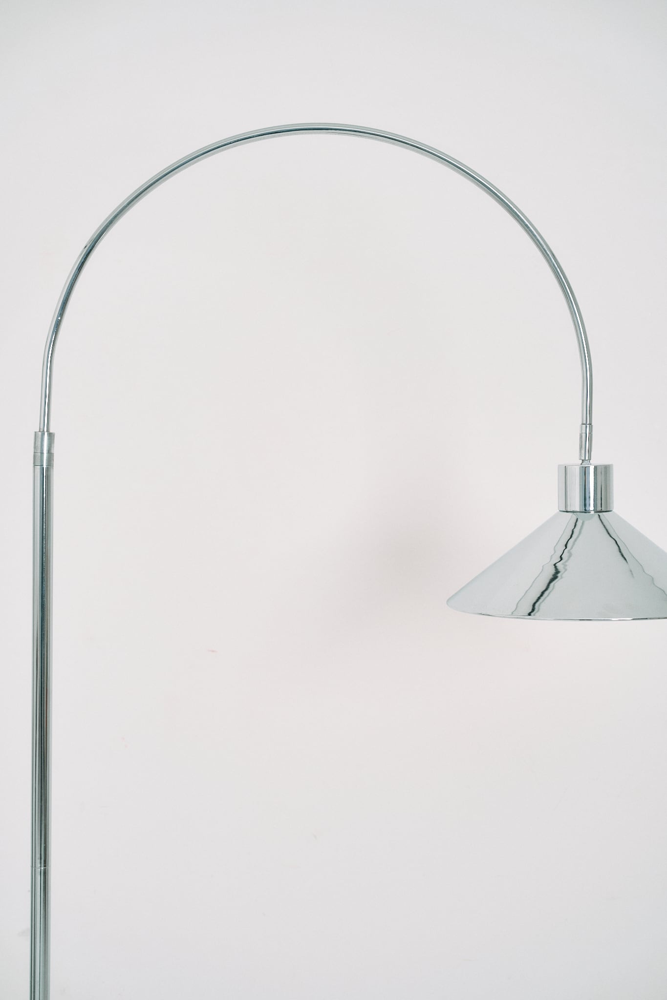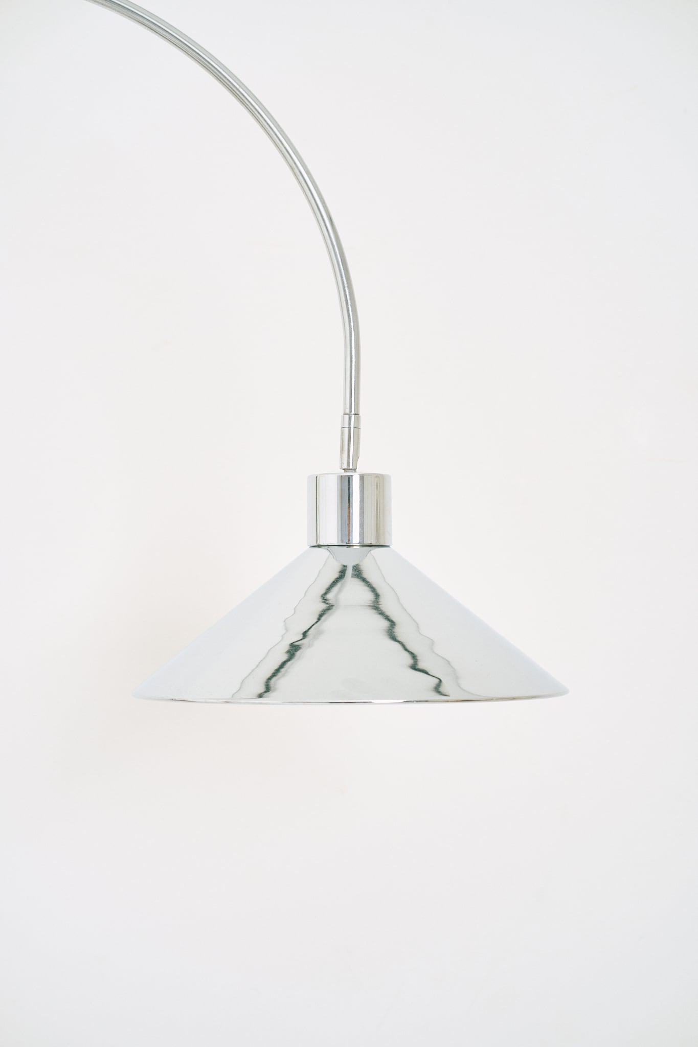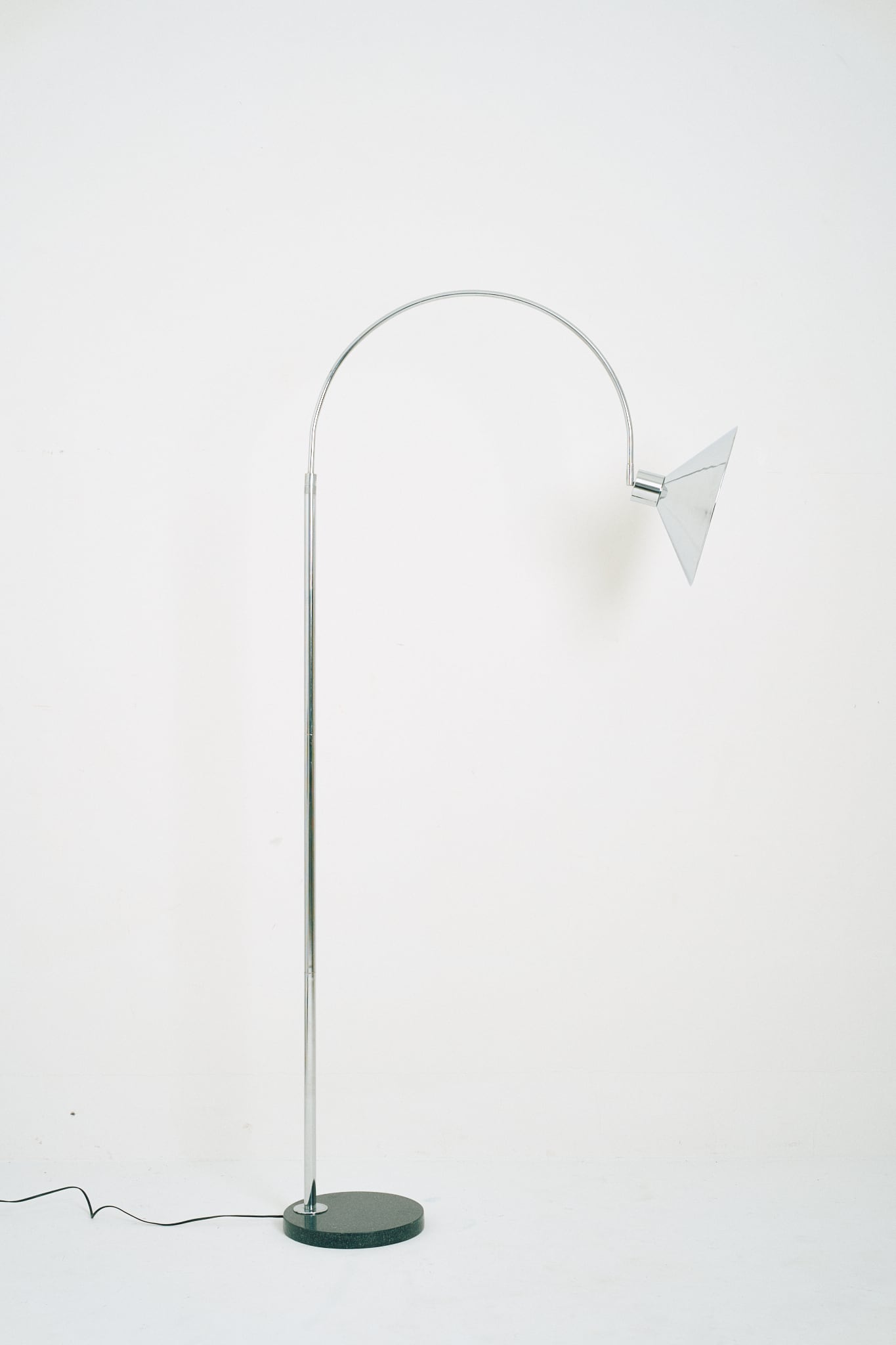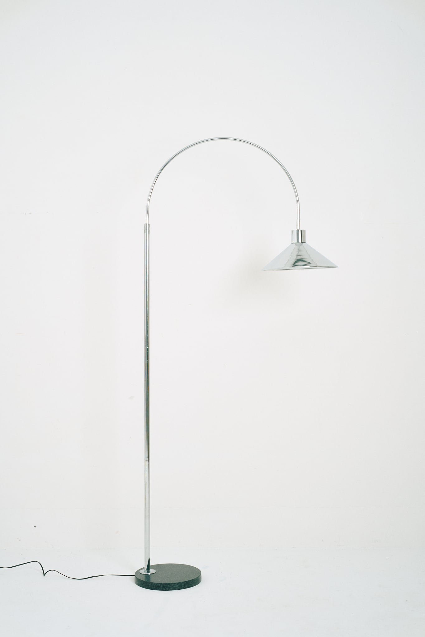 黒い大理石のベースから支柱が伸び、アーチを描いてシェードまで繋がるデザイン。