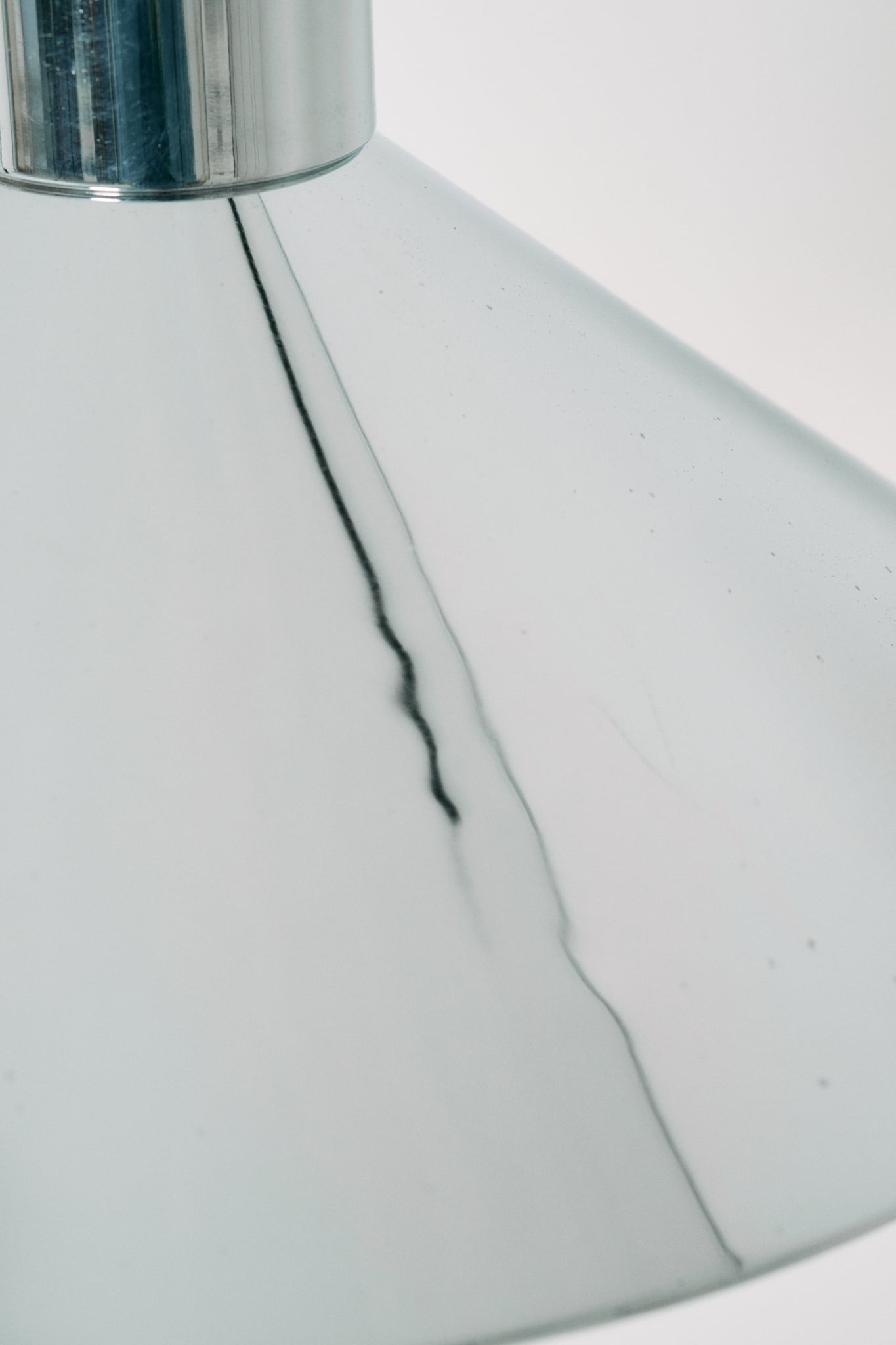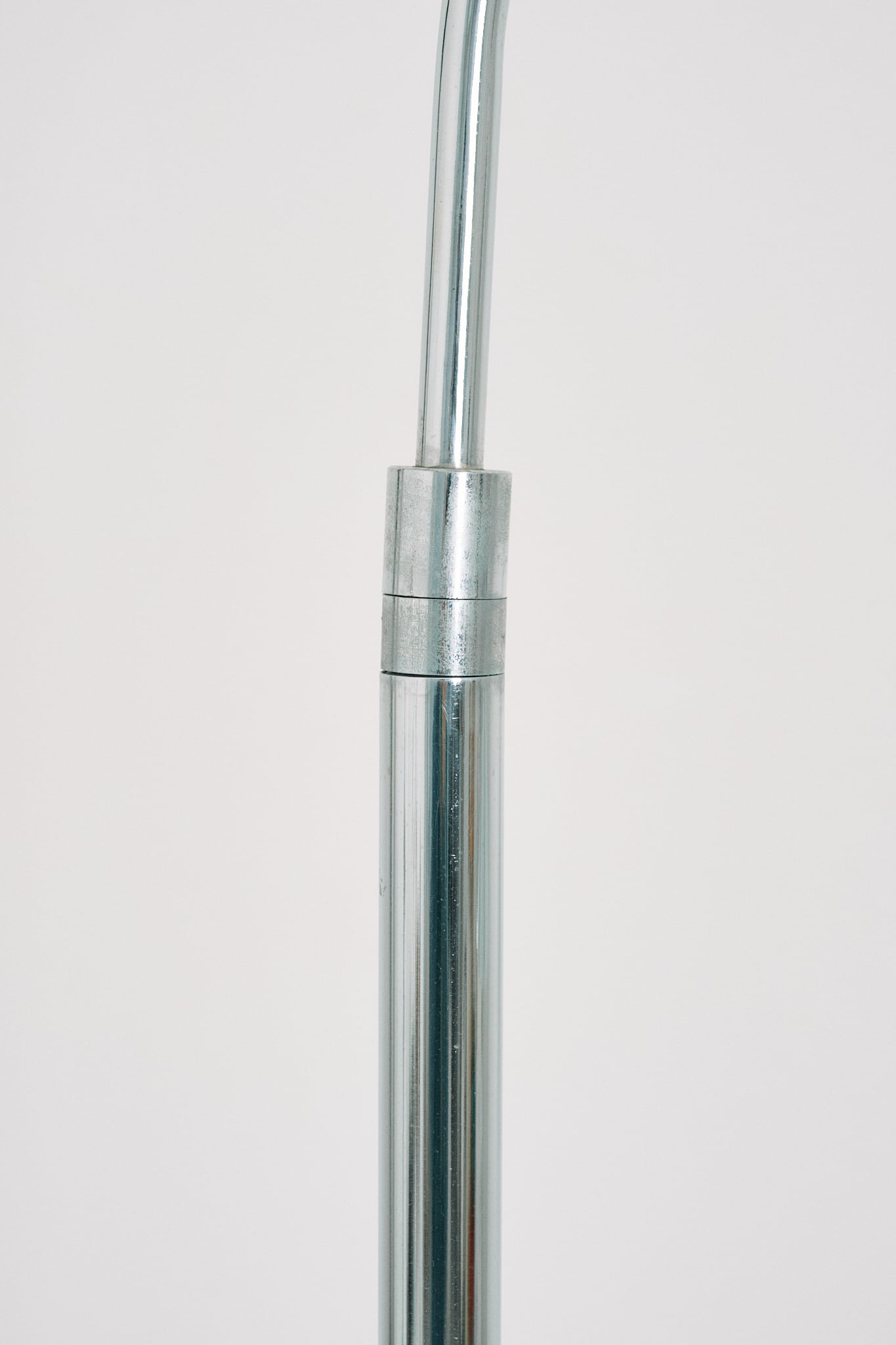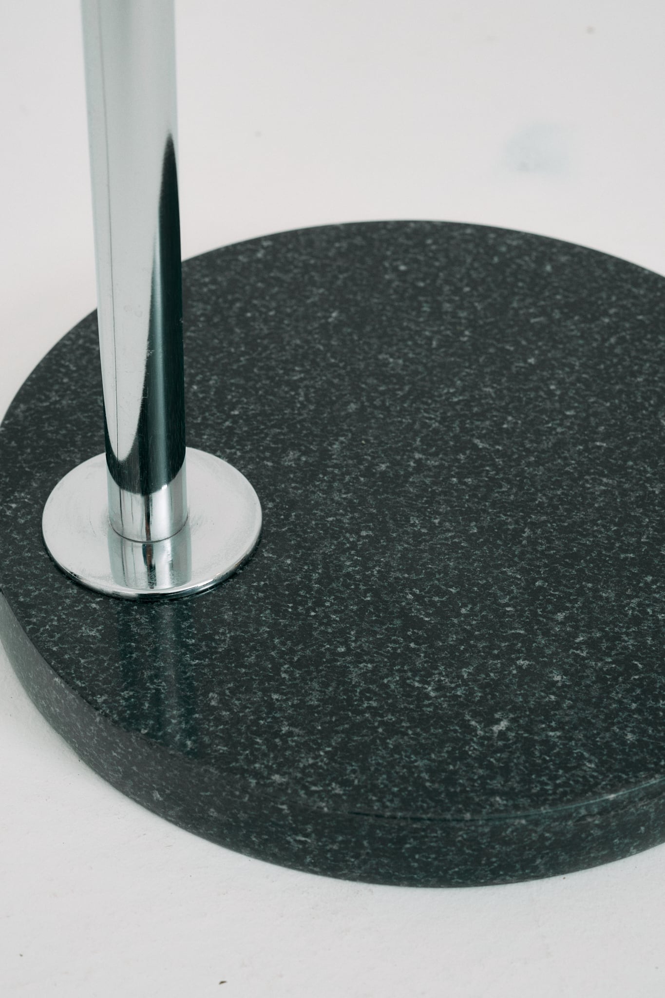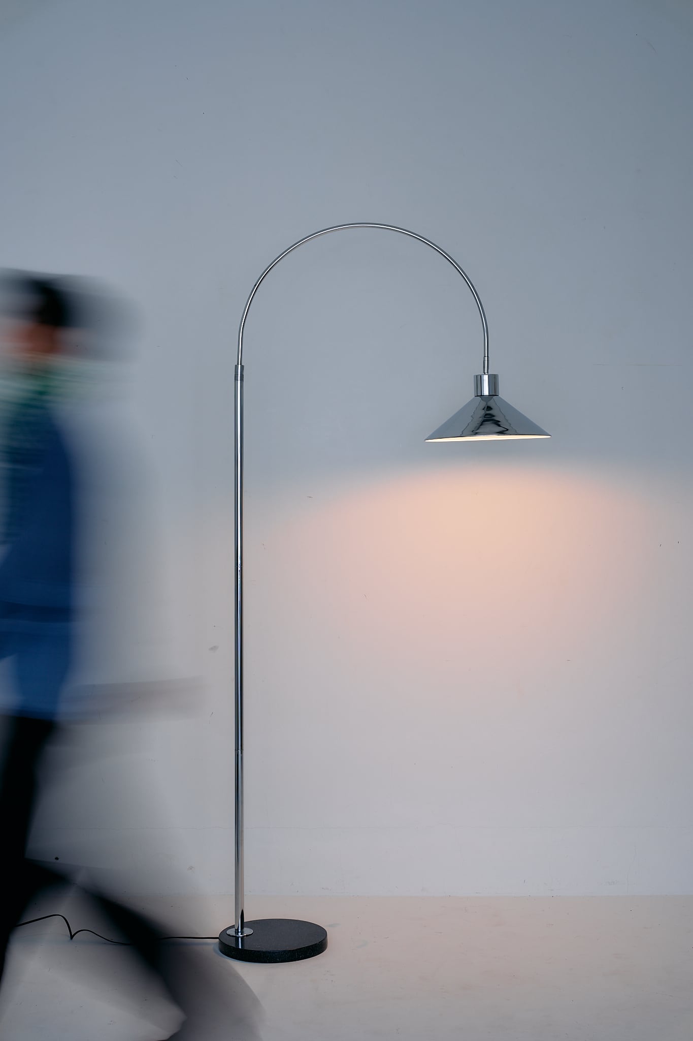 黒い大理石のベースから支柱が伸び、アーチを描いてシェードまで繋がるデザイン。