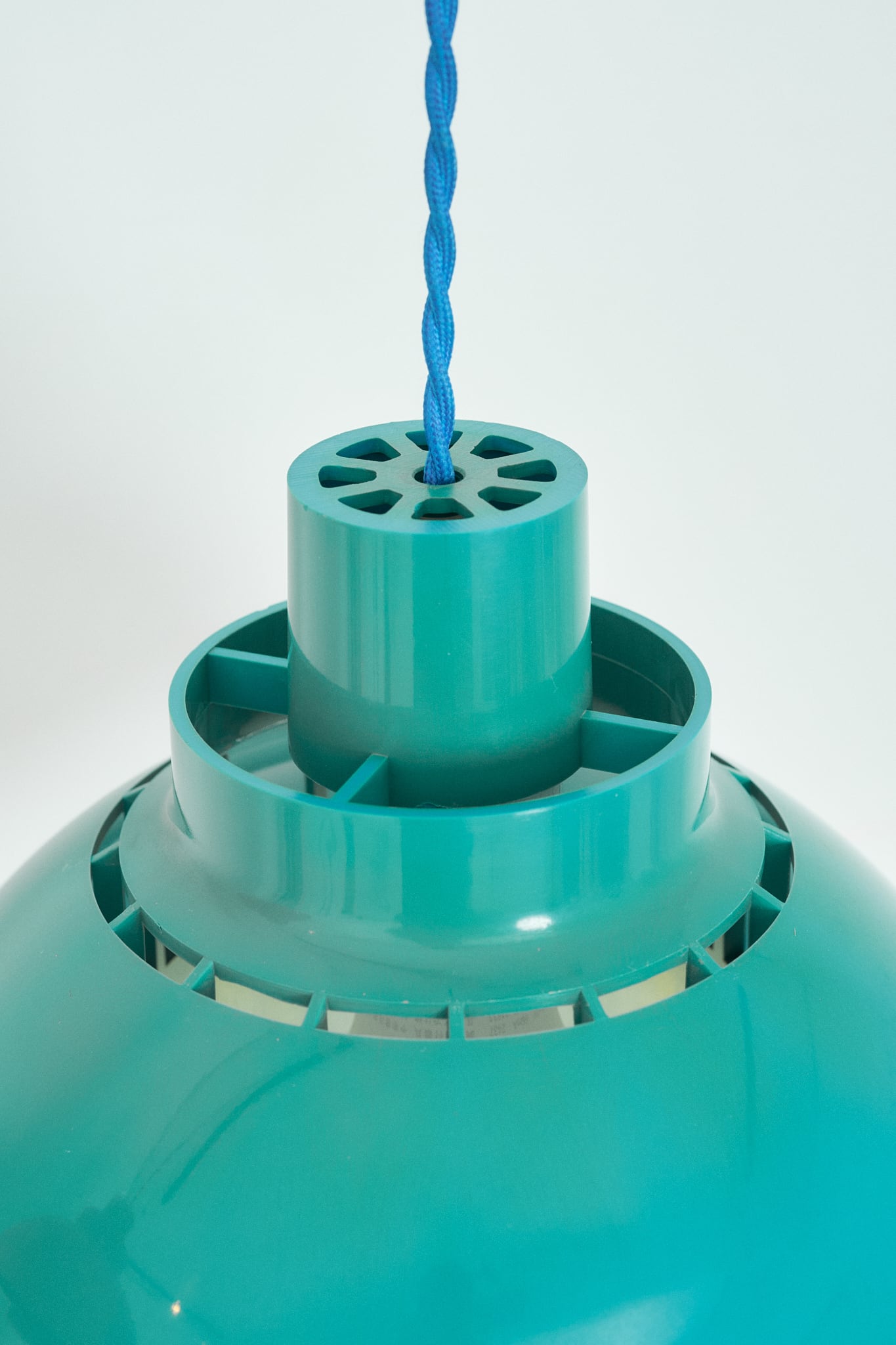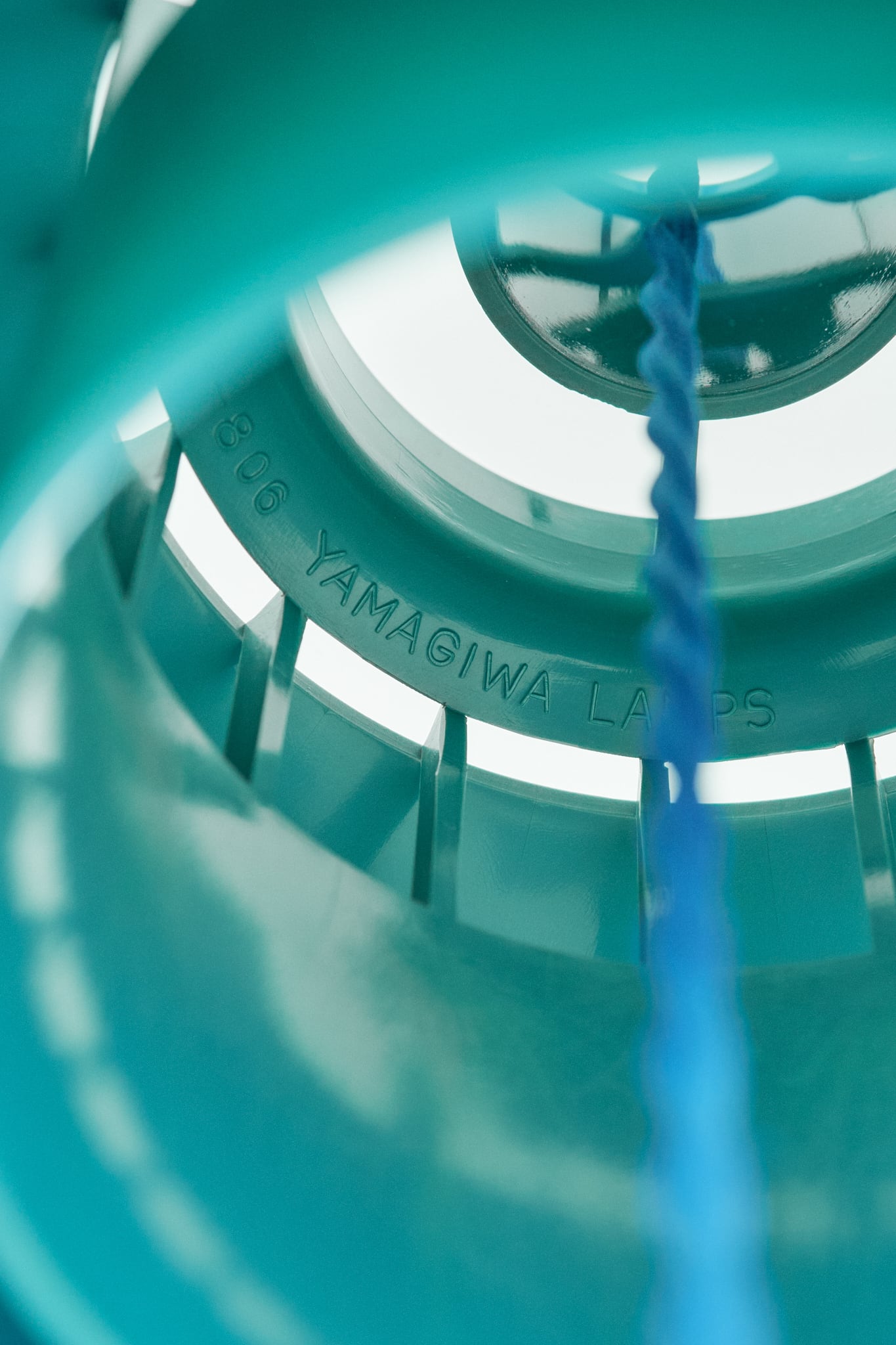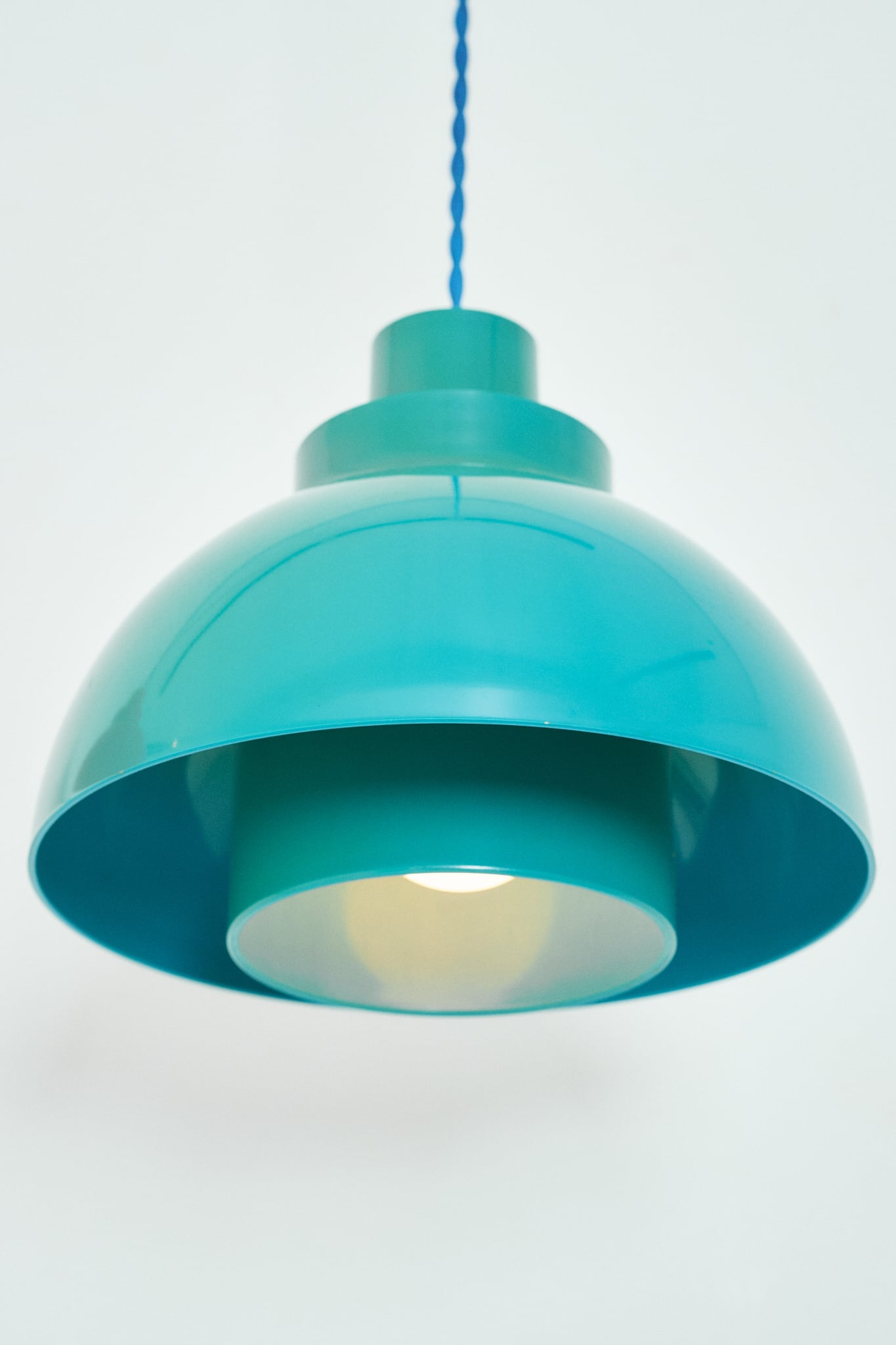 入荷した状態ではコードが傷んでおり、新しいコードに交換済みで安心して清潔にご利用いただけます。一般的にペンダントライトのコードは白か黒ですが、今回の個体のオリジナルはシェードと同色のコードでした。その配色がとても愛らしく、敬意を払って交換後も同様の配色としています。今回は同様の商品でオレンジの配色も入荷していますので、併せてご検討ください。