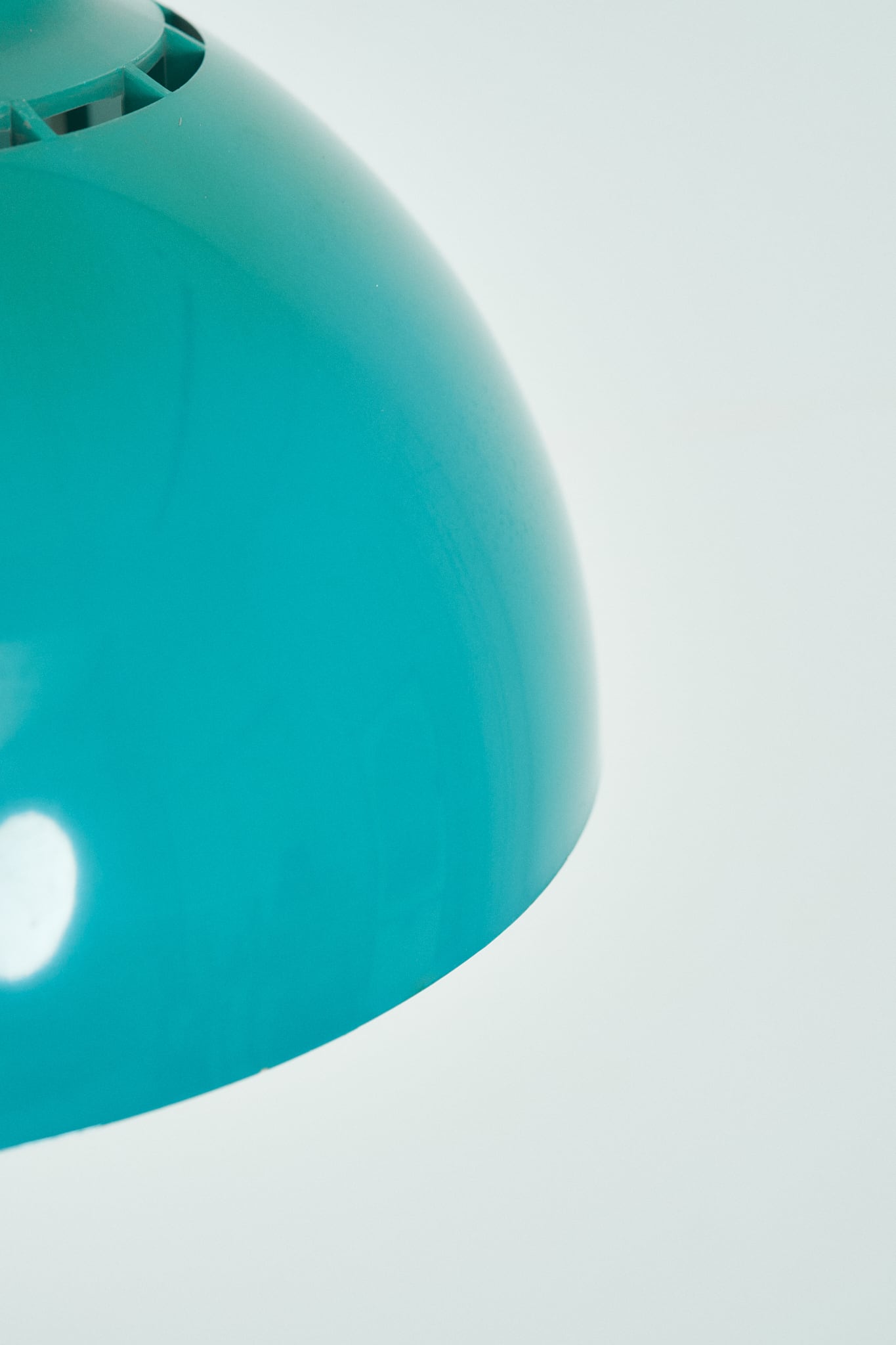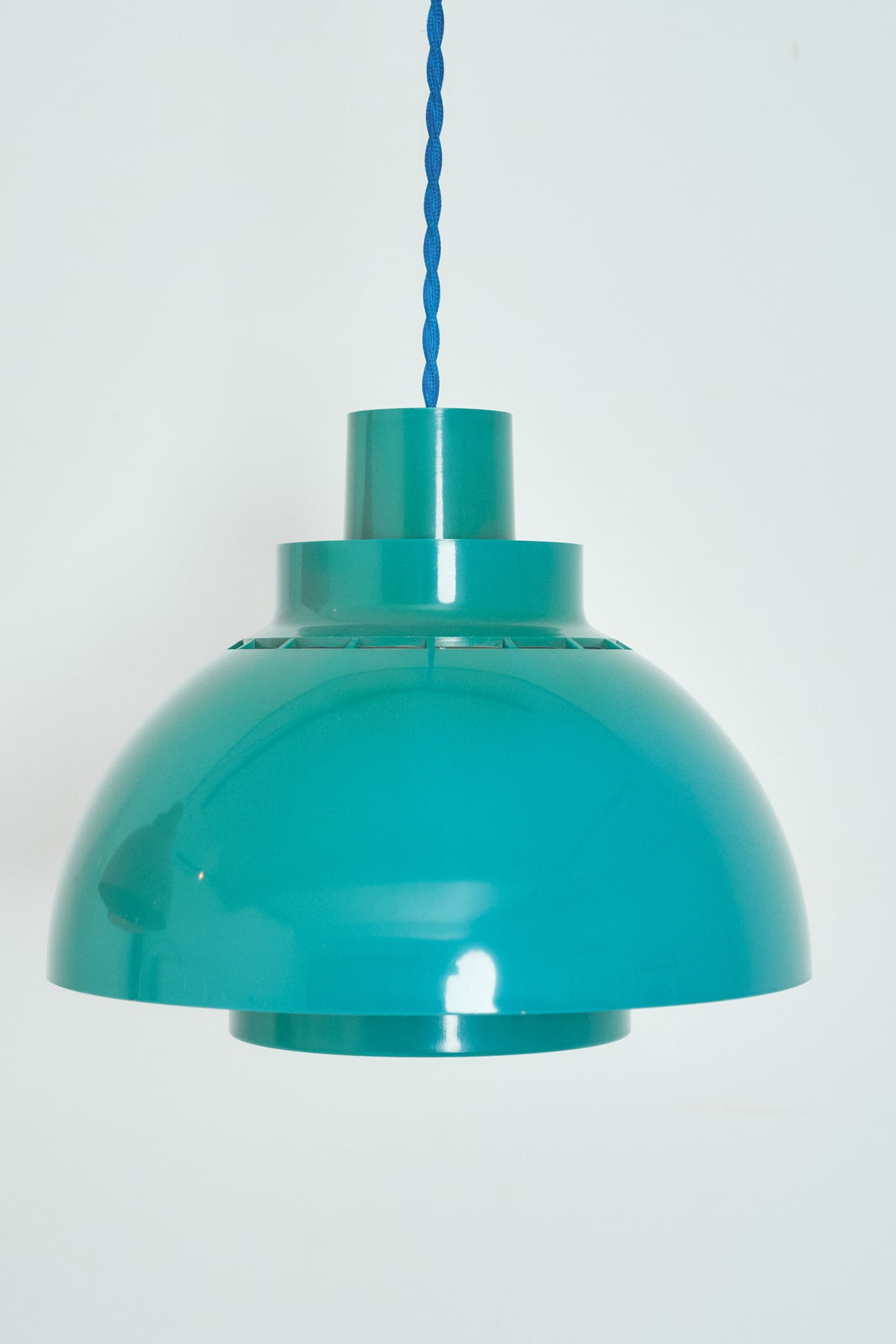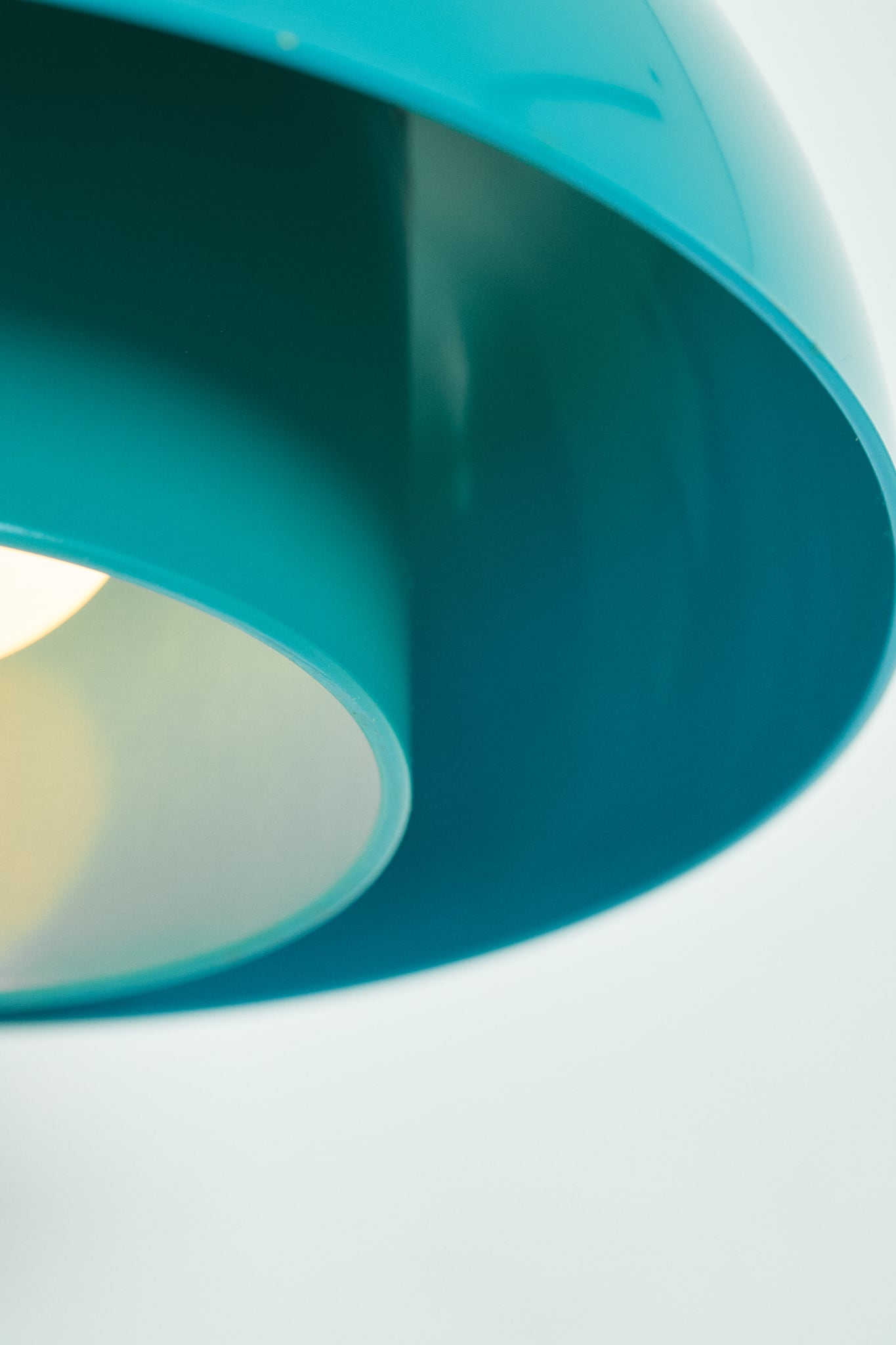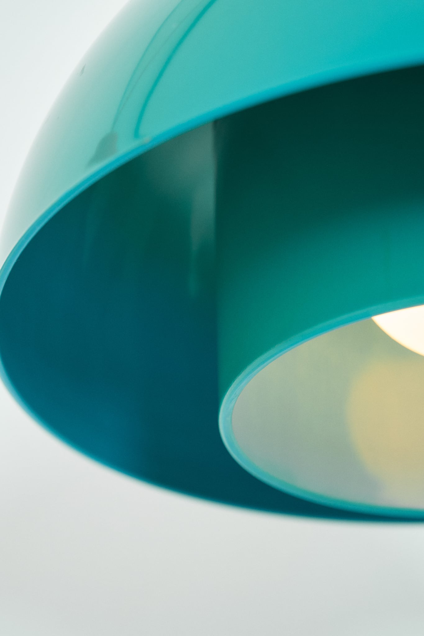 入荷した状態ではコードが傷んでおり、新しいコードに交換済みで安心して清潔にご利用いただけます。一般的にペンダントライトのコードは白か黒ですが、今回の個体のオリジナルはシェードと同色のコードでした。その配色がとても愛らしく、敬意を払って交換後も同様の配色としています。今回は同様の商品でオレンジの配色も入荷していますので、併せてご検討ください。