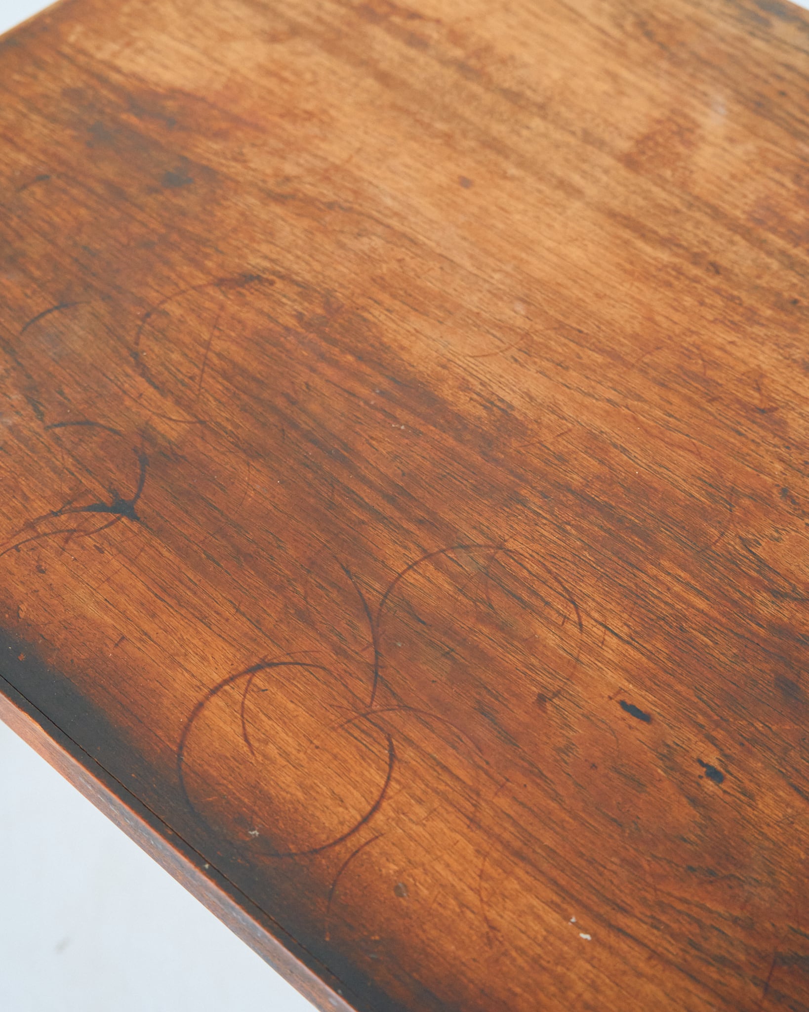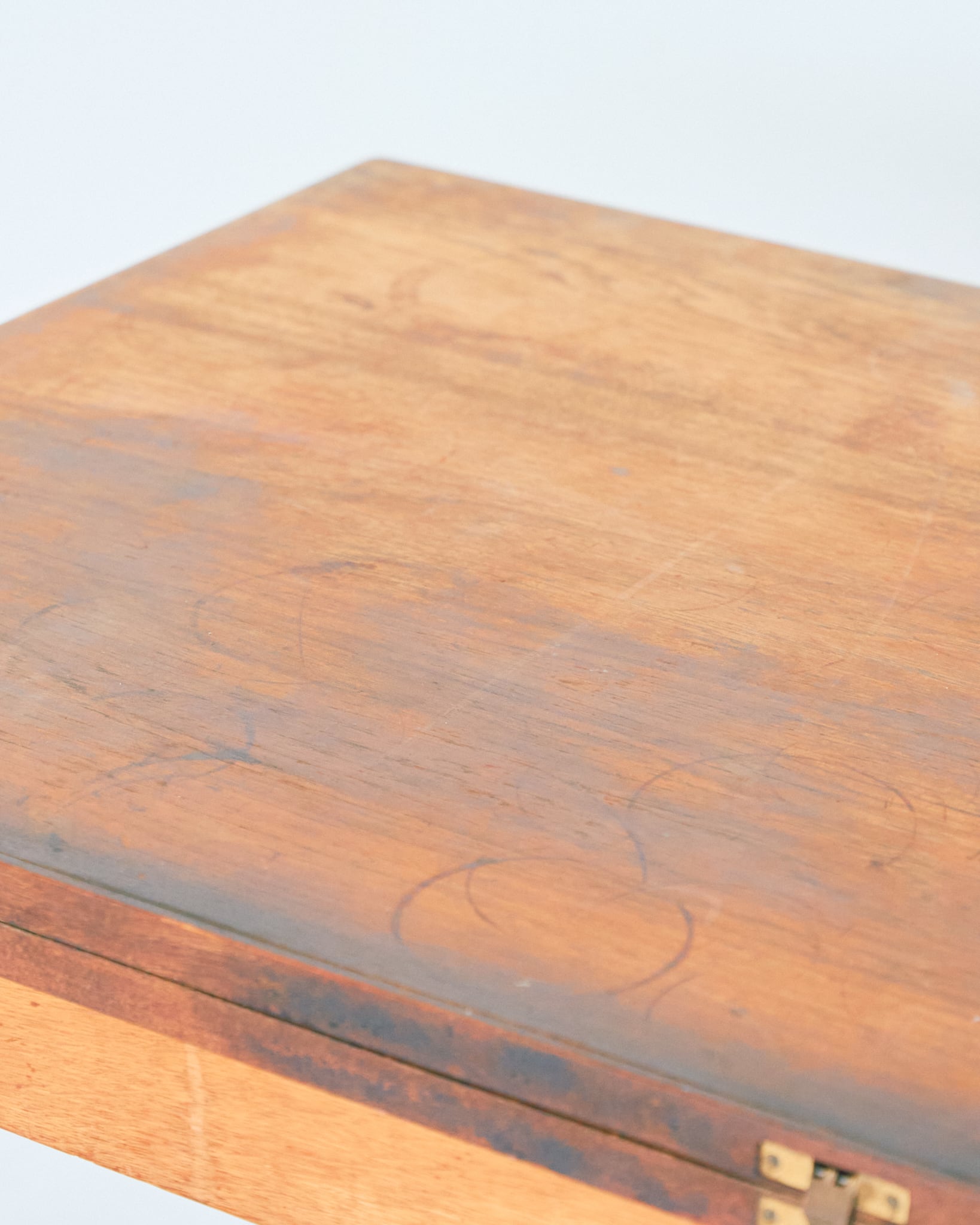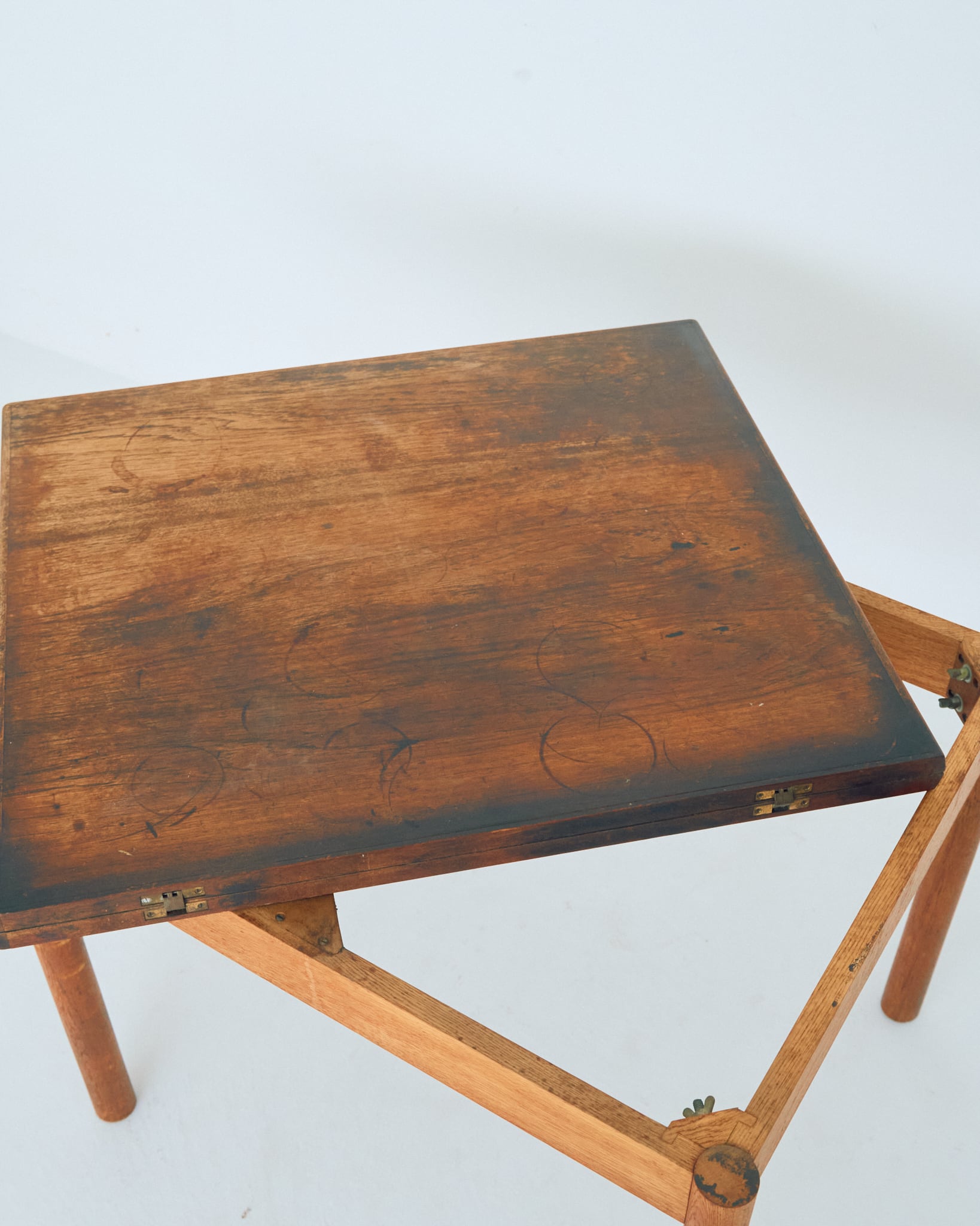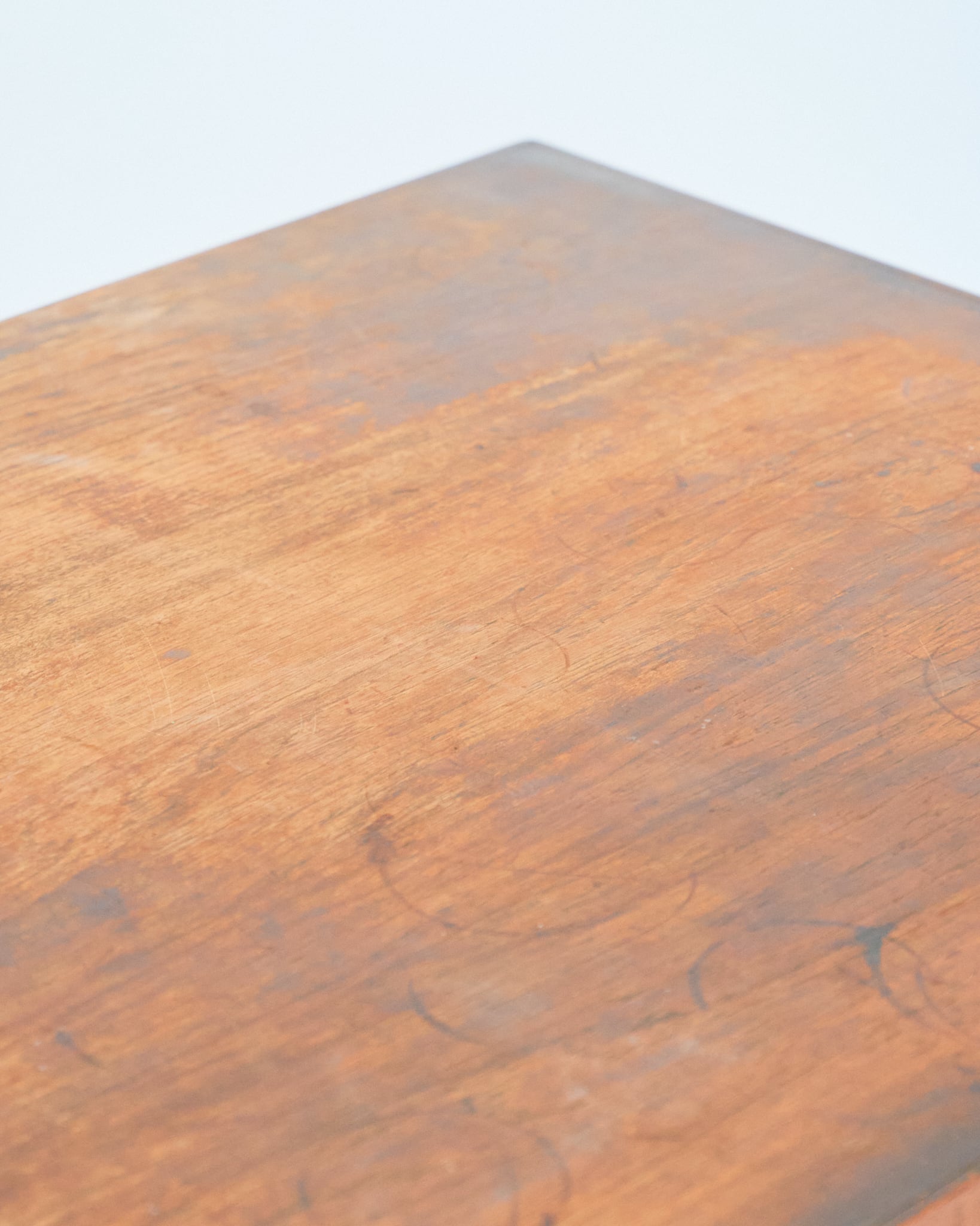 使用されているマイナスネジや経年具合などから考察すると、本個体は60-70年代の個体だと思われます。天板には輪ジミや落とし切れない経年の変化があります。古道具として風格漂う佇まいである様に感じます。