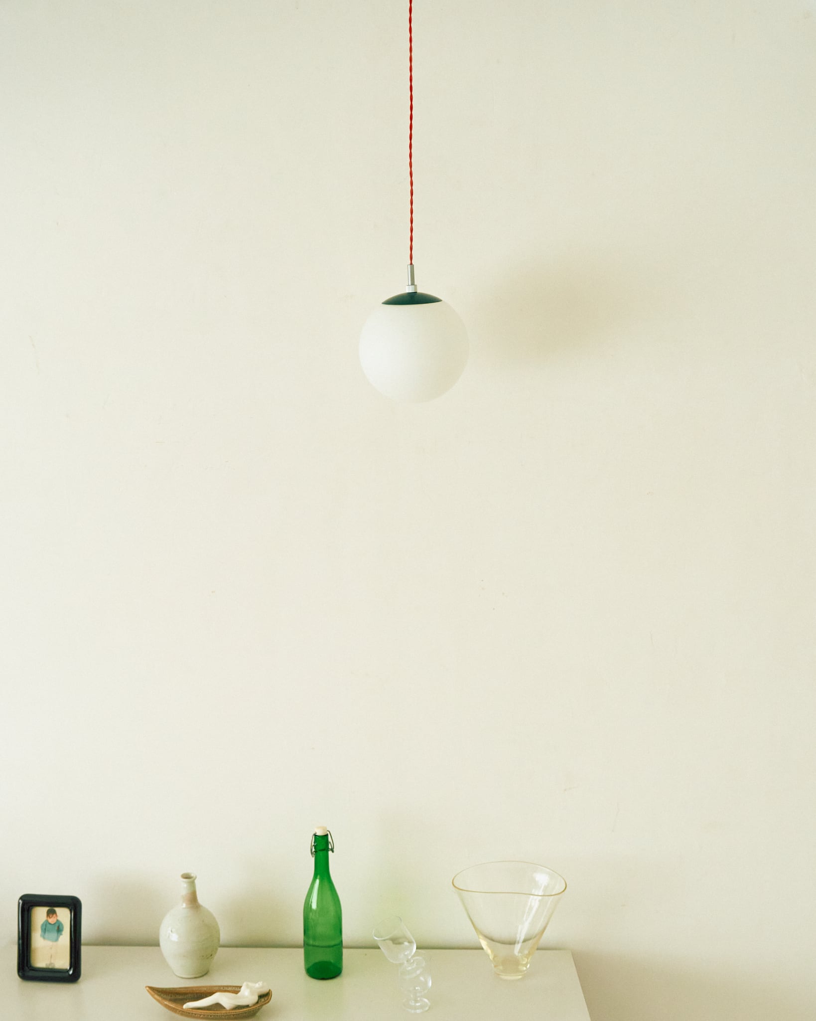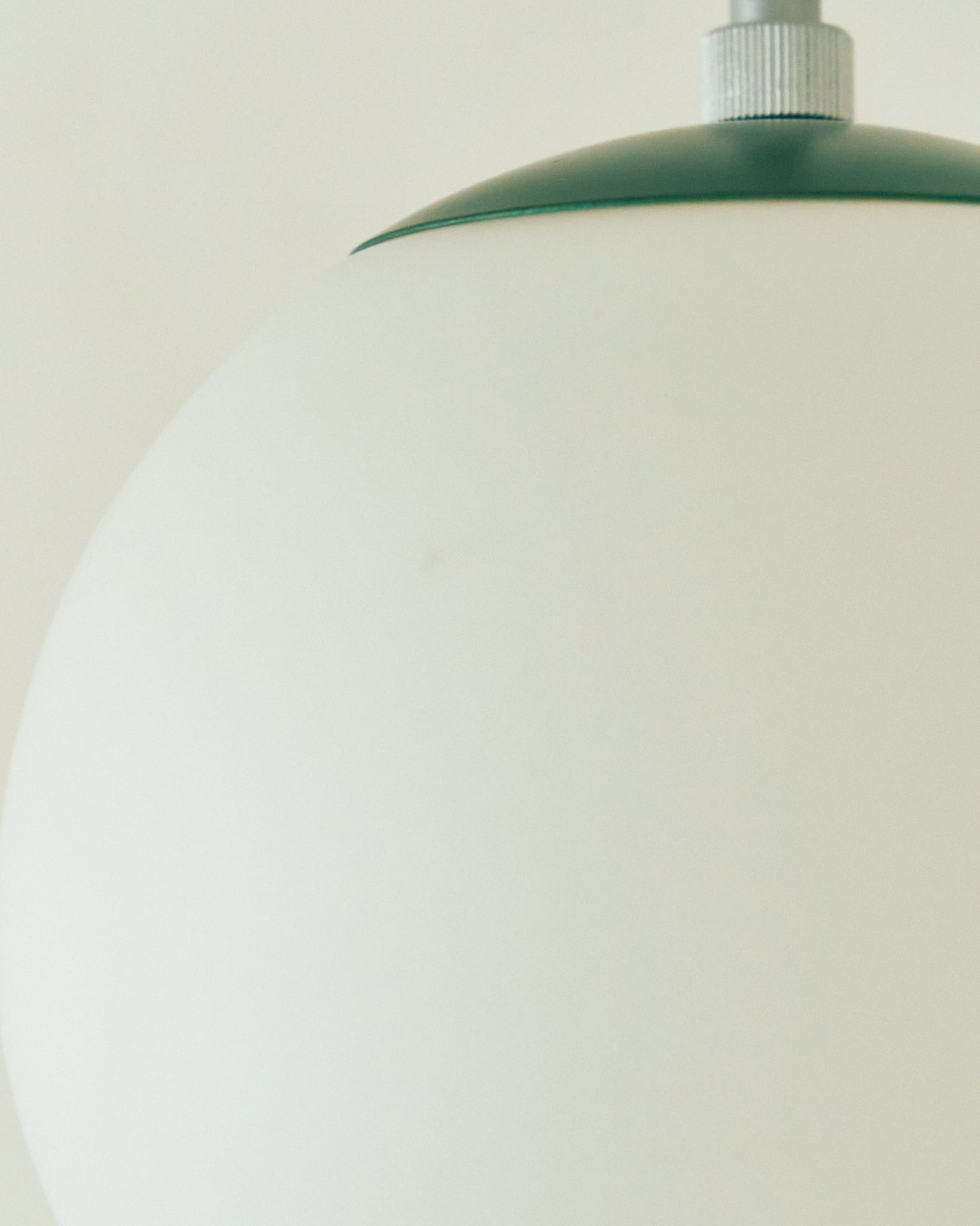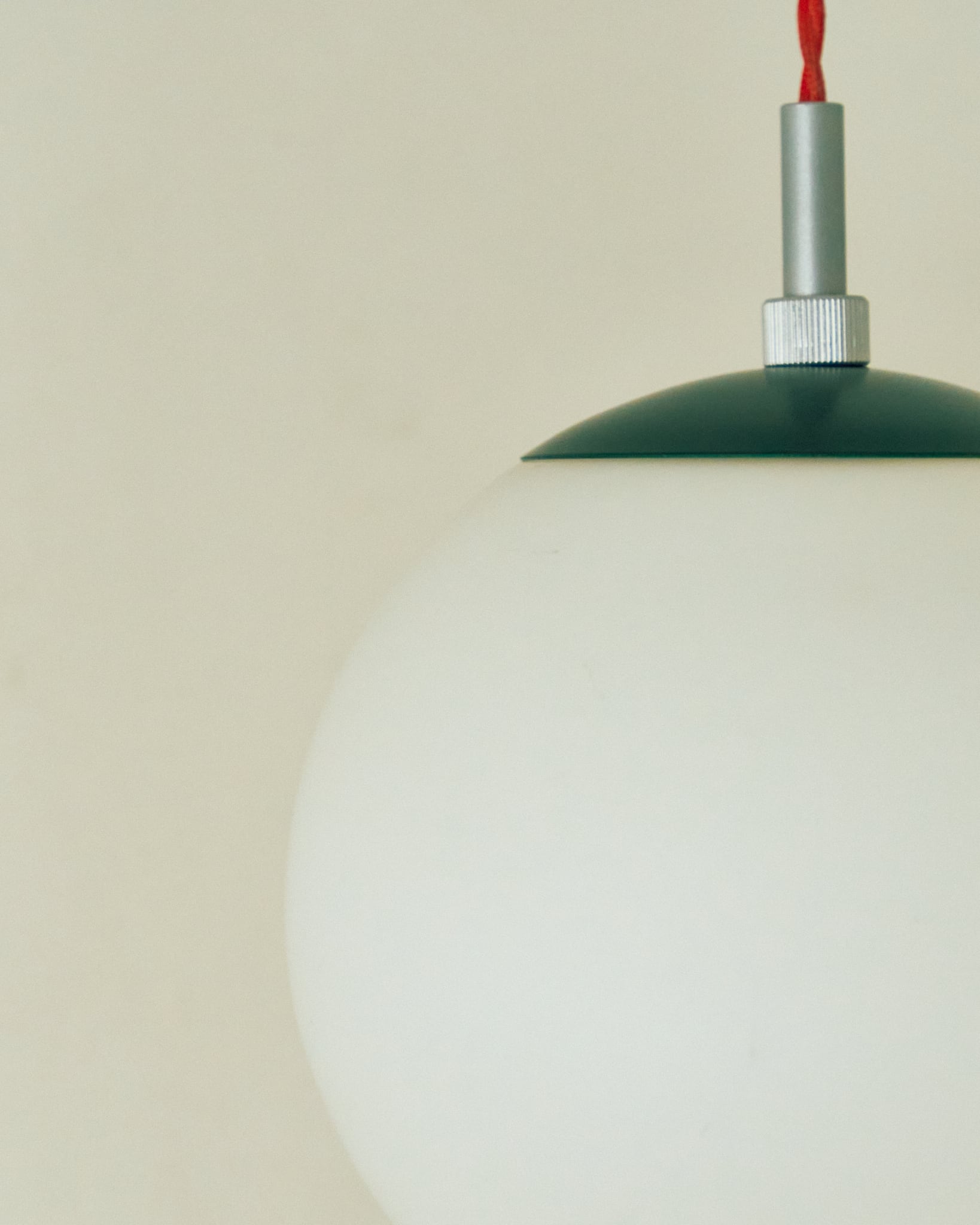 今回の商品はマットな質感のガラスグローブが上品なペンダントライトです。シェード上部の緑色の上蓋と、コードに使用されている赤色とのコントラストが面白い組み合わせです。使用されている電気部品から考察すると、60-70年代の日本製、恐らくはNational製のものであると考えられます。シェードにはクリーニングでは落としきれない擦り跡などありますが、コンディションは良好です。