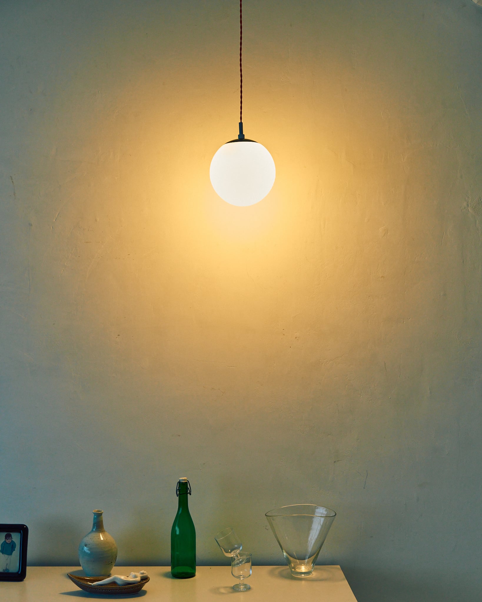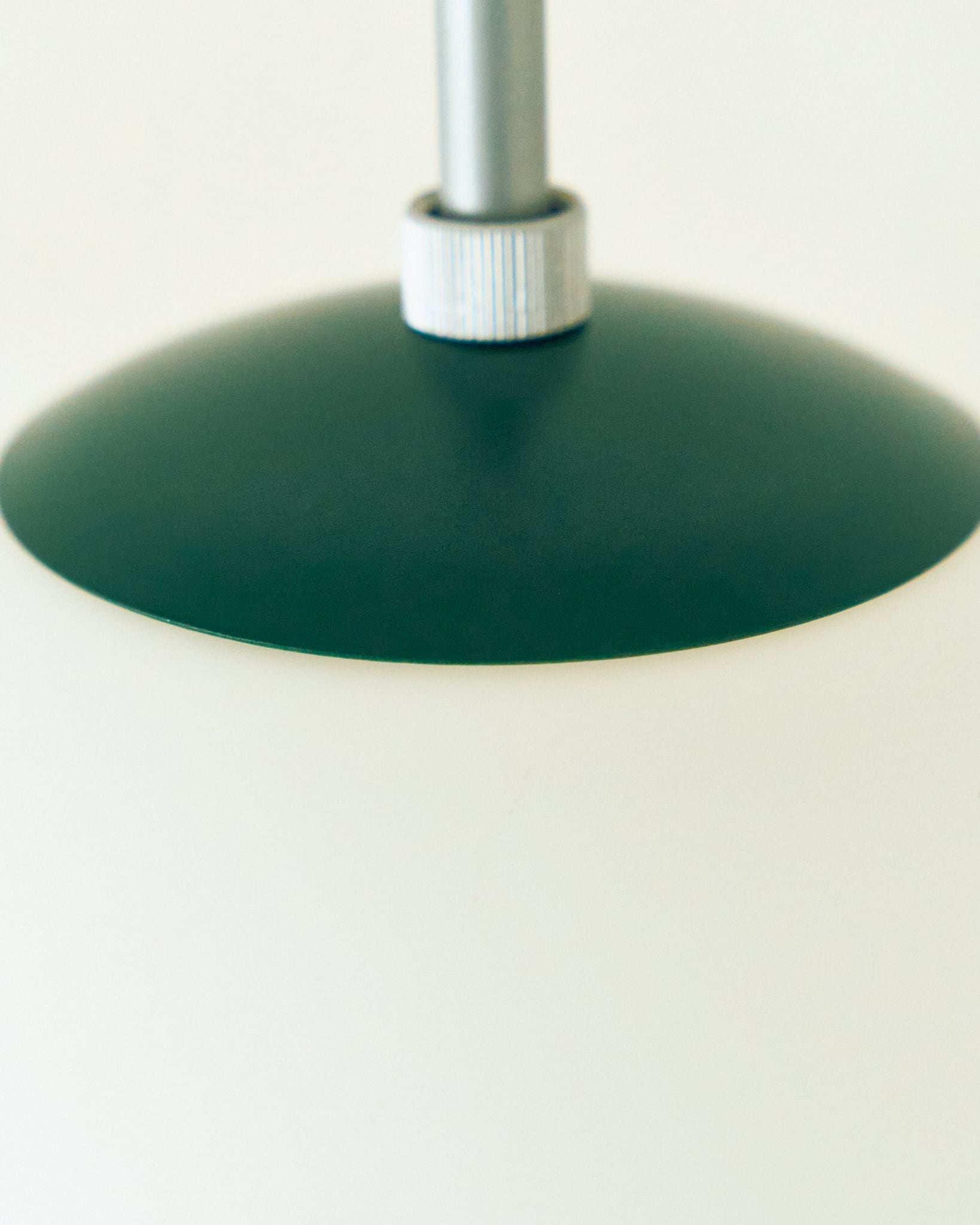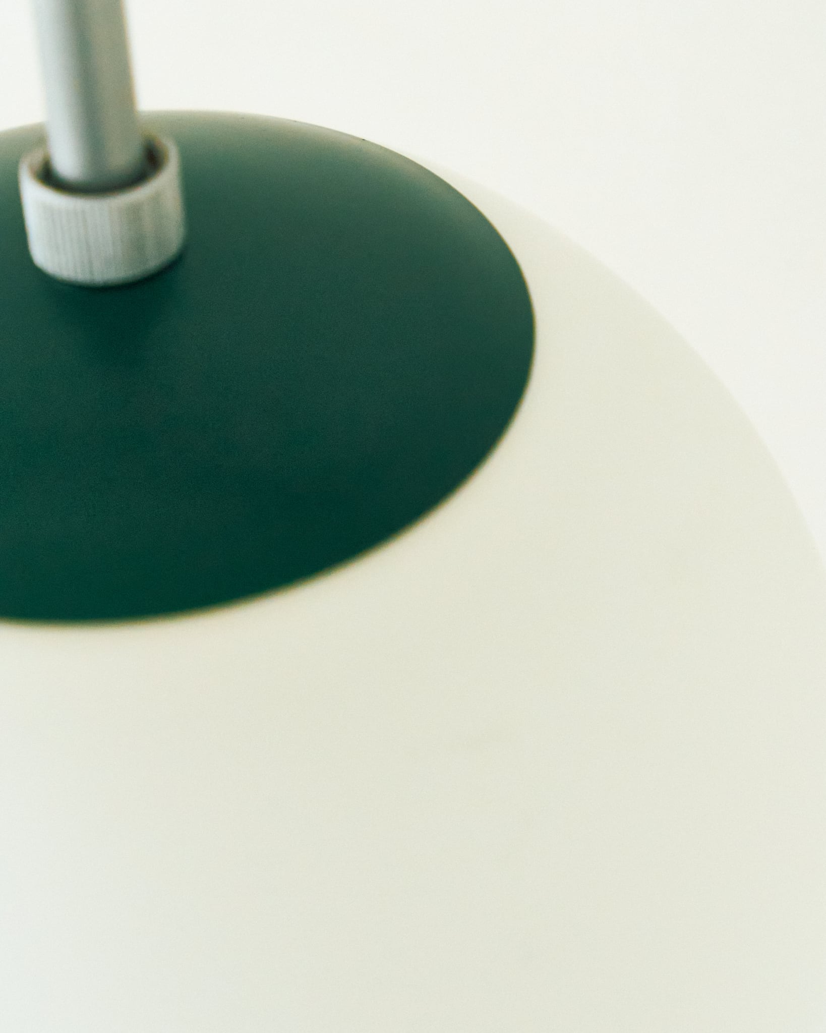 今回の商品はマットな質感のガラスグローブが上品なペンダントライトです。シェード上部の緑色の上蓋と、コードに使用されている赤色とのコントラストが面白い組み合わせです。使用されている電気部品から考察すると、60-70年代の日本製、恐らくはNational製のものであると考えられます。シェードにはクリーニングでは落としきれない擦り跡などありますが、コンディションは良好です。