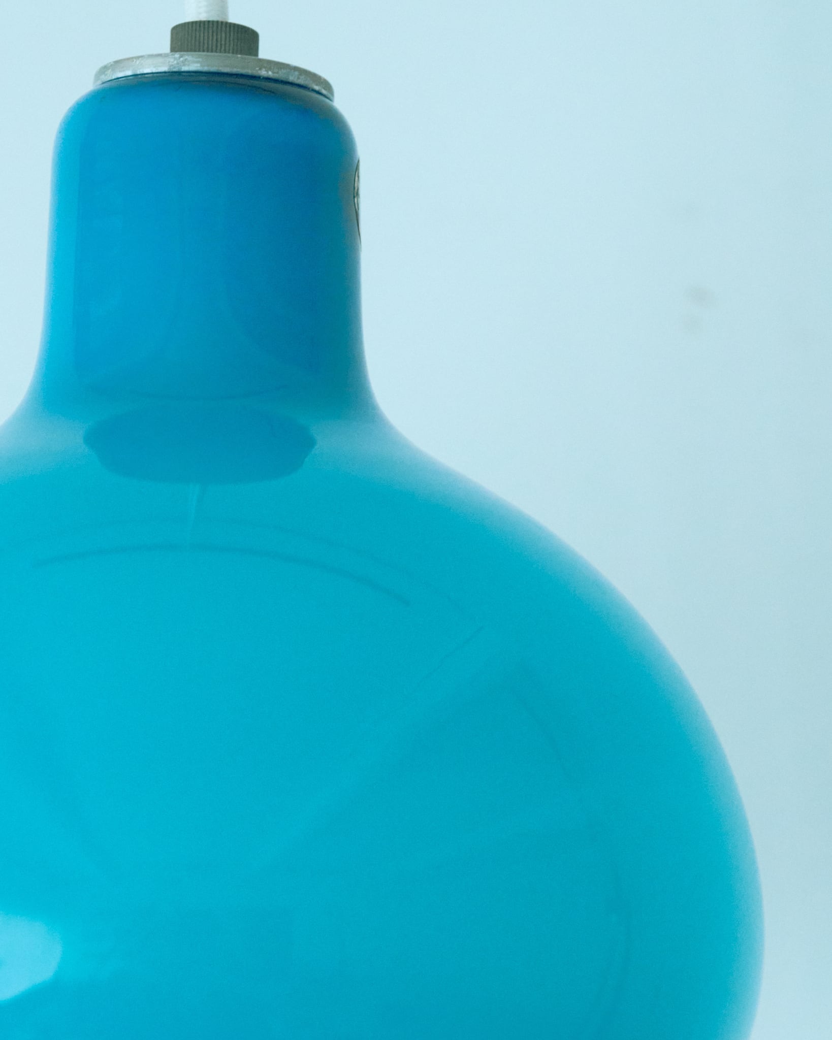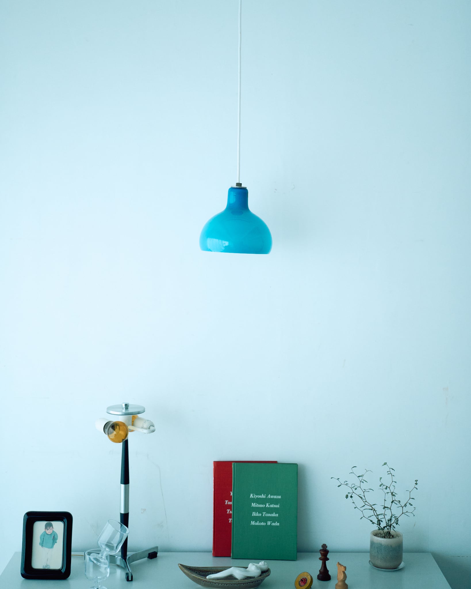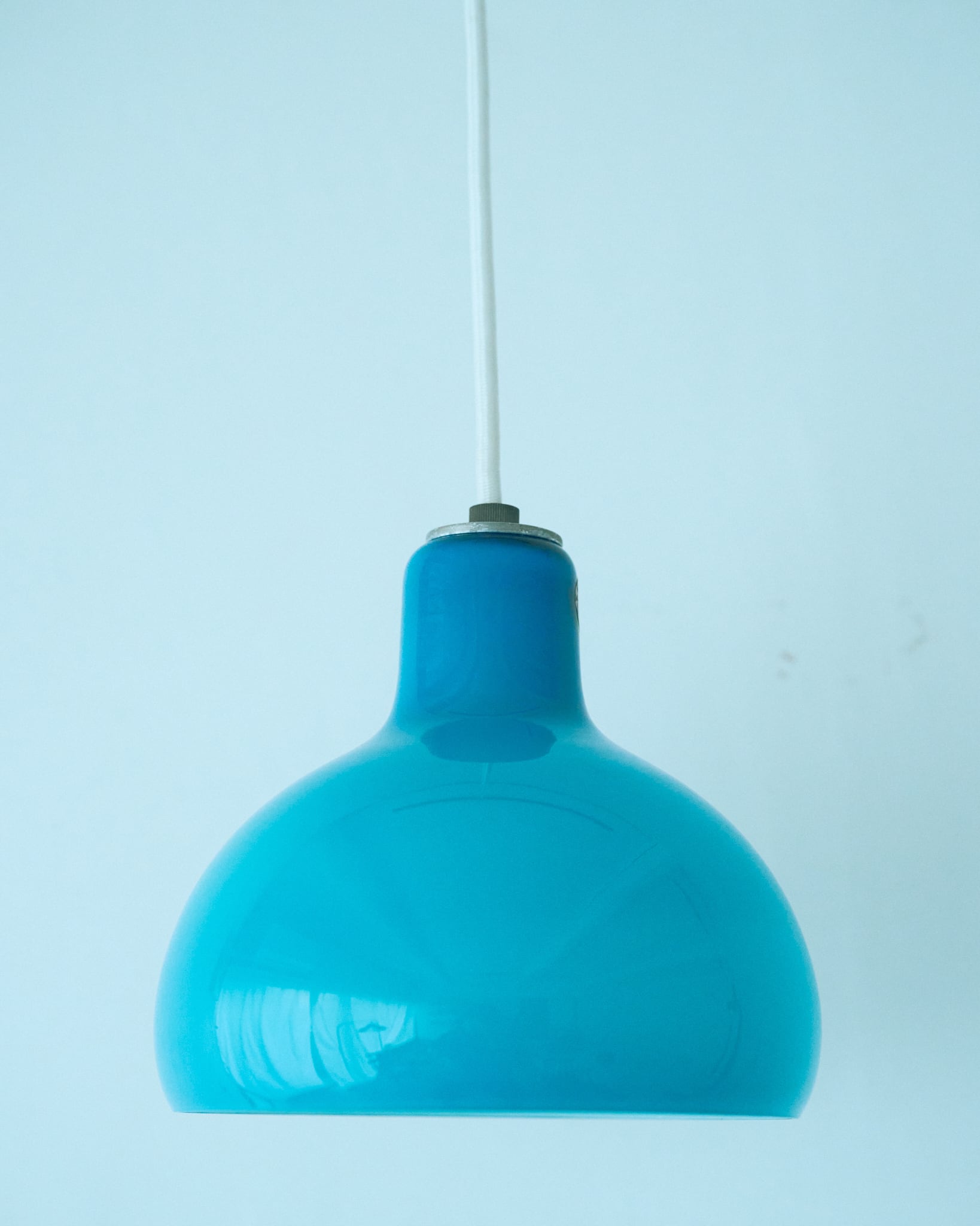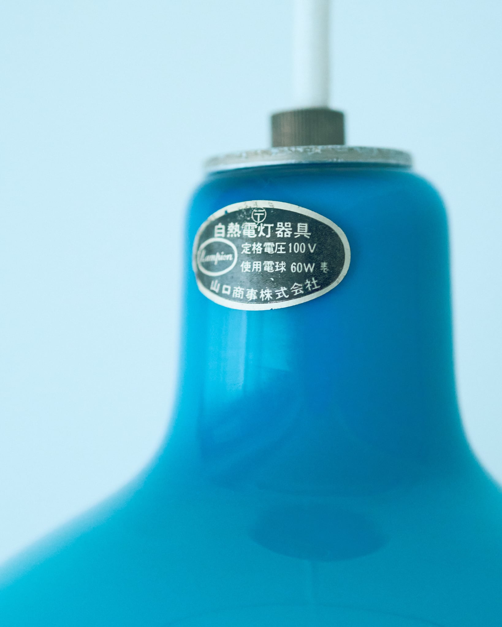 今回の商品は、サイズとカラーが可愛らしいガラス製のペンダントライトです。60年代頃の個体と考えられます。シェードには販売元と思われる山口商事のシールが貼られています。日本製のペンダントライトだと思われますが、もしかすると海外から輸入されたものかもしれません。それくらい雰囲気が良いです。