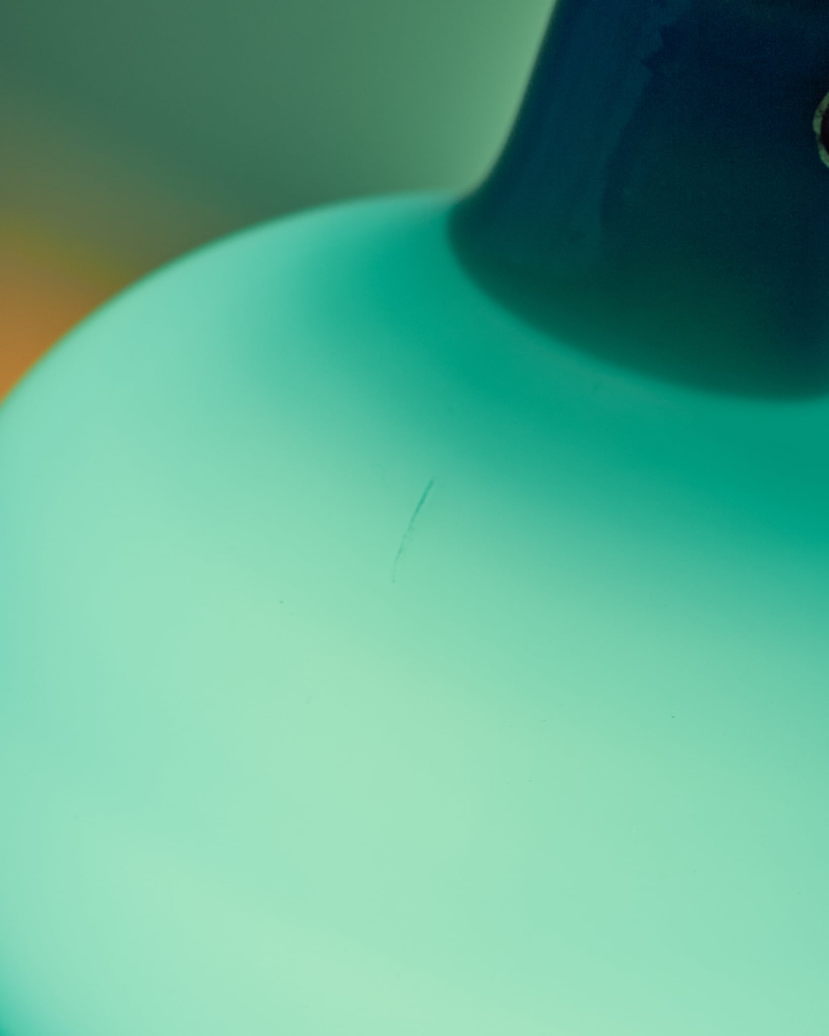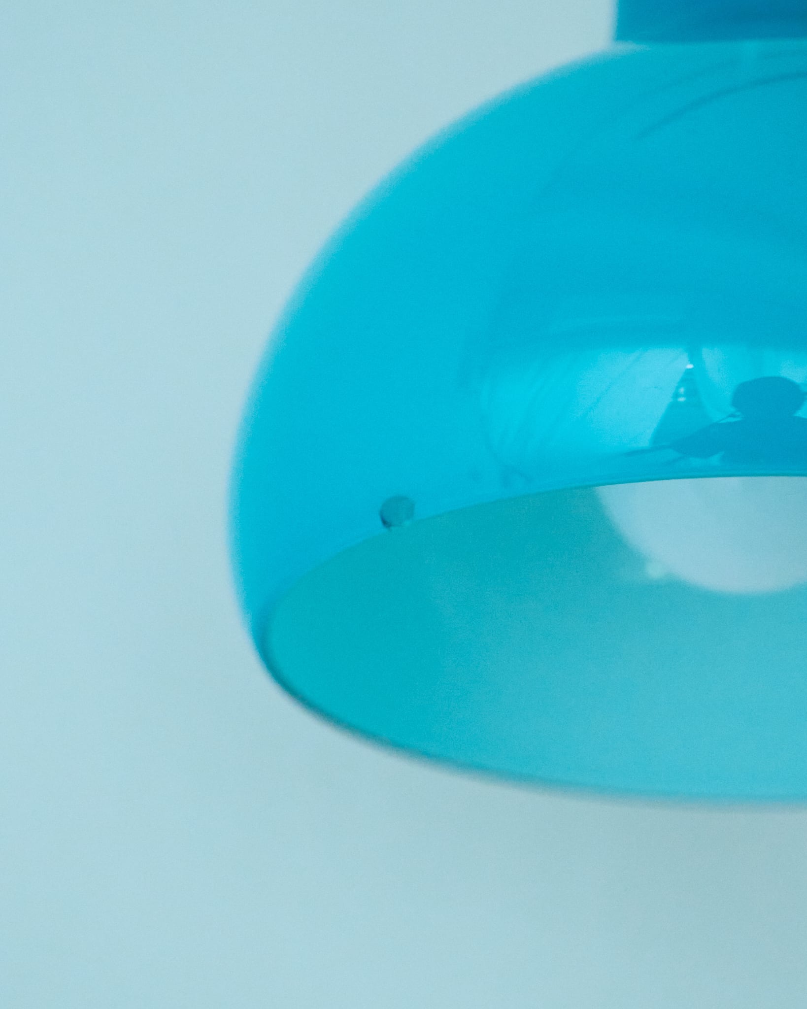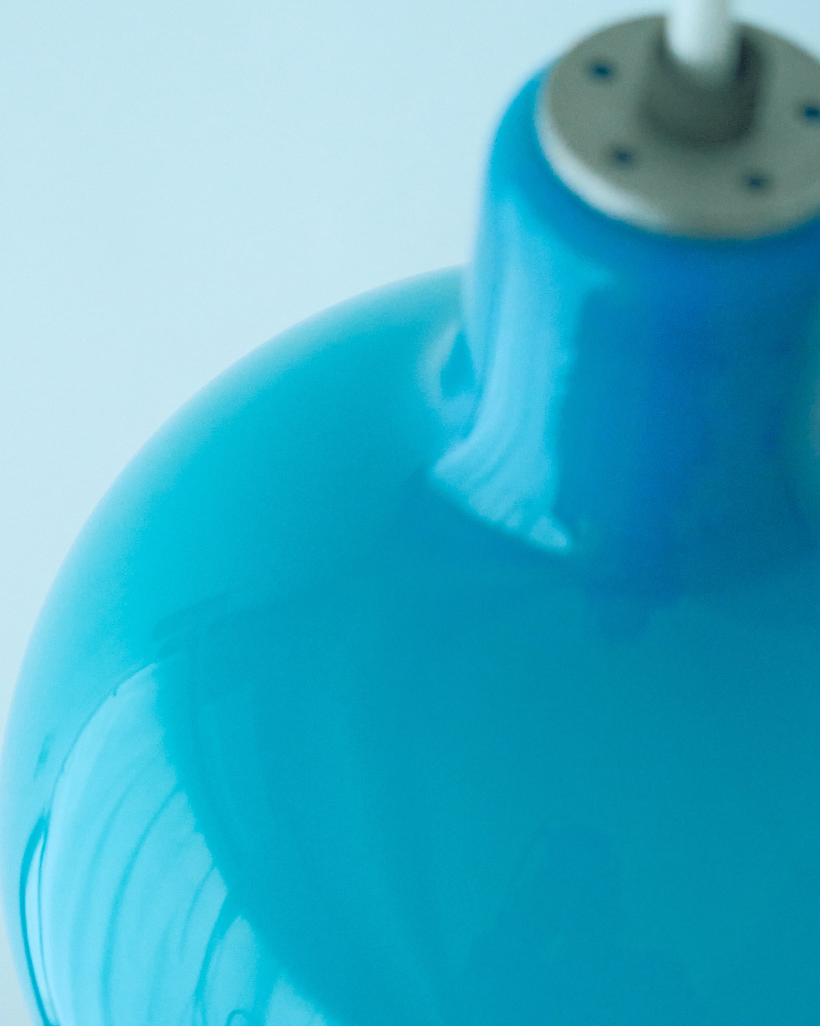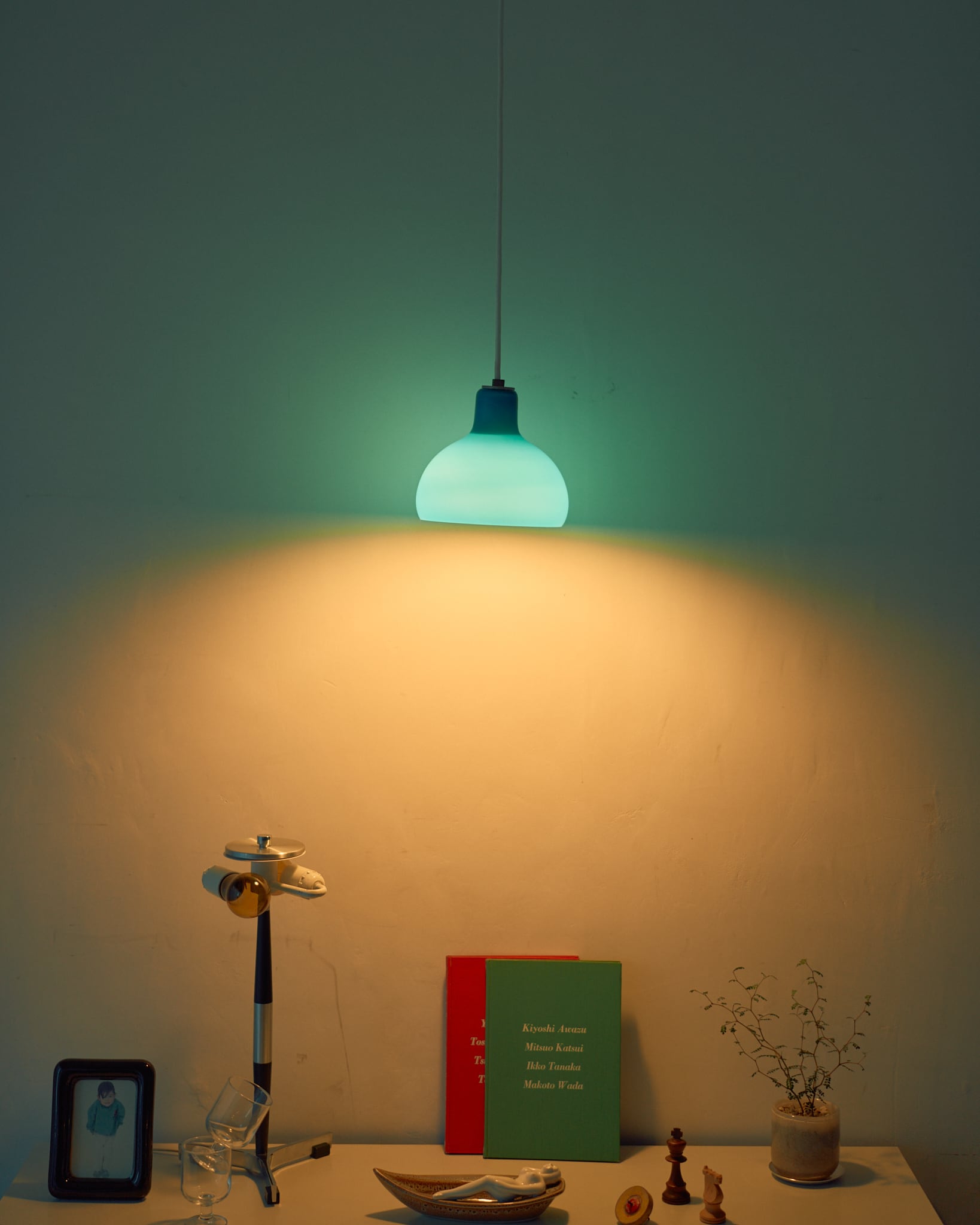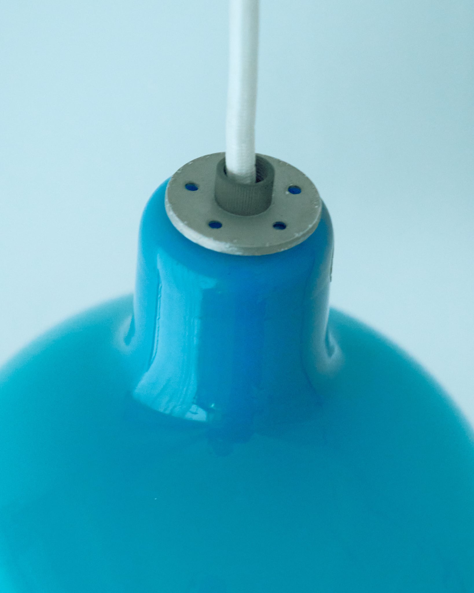 今回の商品は、サイズとカラーが可愛らしいガラス製のペンダントライトです。60年代頃の個体と考えられます。シェードには販売元と思われる山口商事のシールが貼られています。日本製のペンダントライトだと思われますが、もしかすると海外から輸入されたものかもしれません。それくらい雰囲気が良いです。