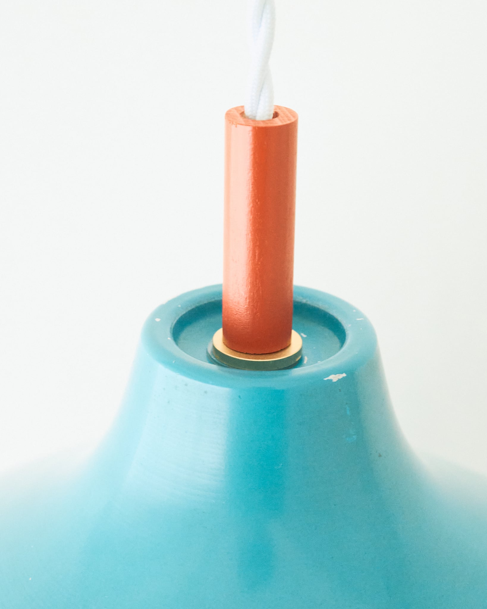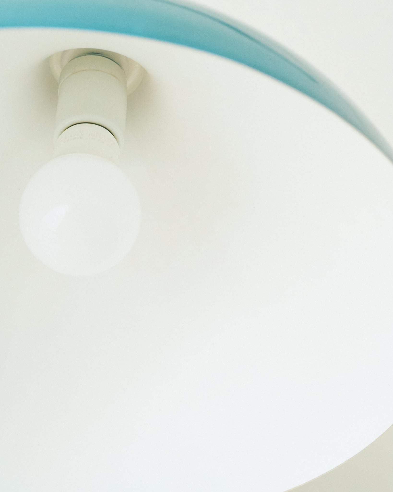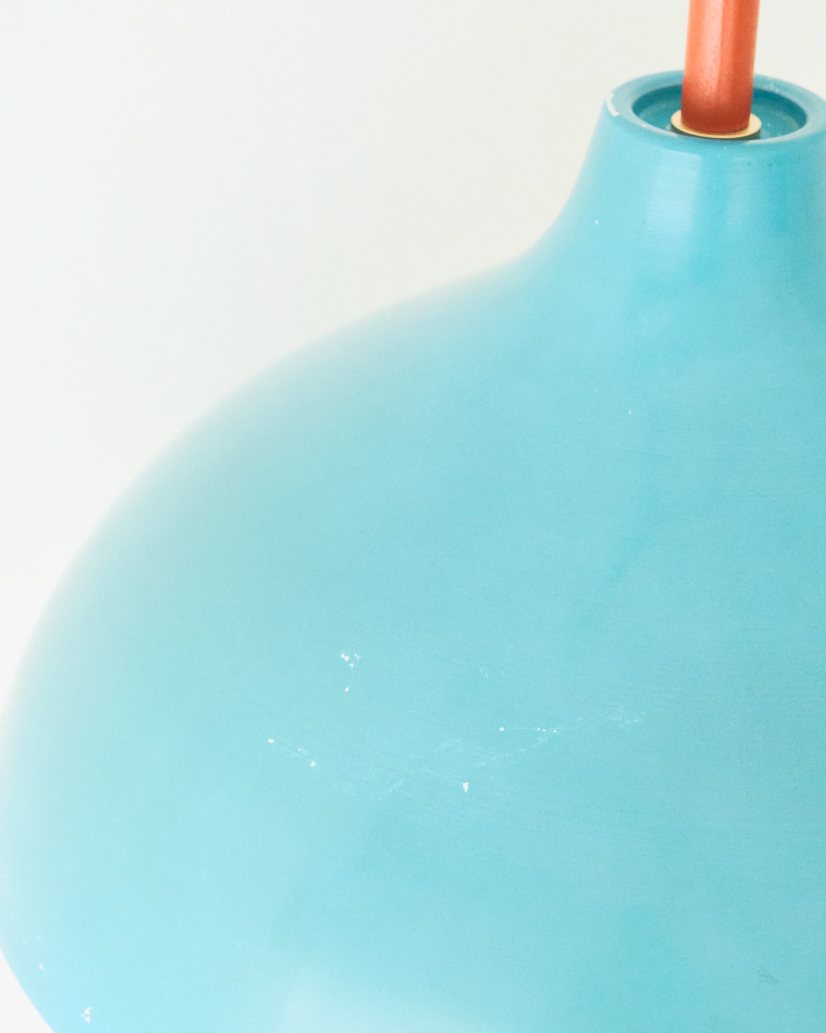 今回の商品は、60年代のヤマギワ製のペンダントライトです。シェードは爽やかな青色で、シェード内側には塗装の傷みがあったため、目立たないよう簡易的に再塗装を施しています。シェード上部には、電気コードの接地部を隠すための木製のパーツを組み合わせています。