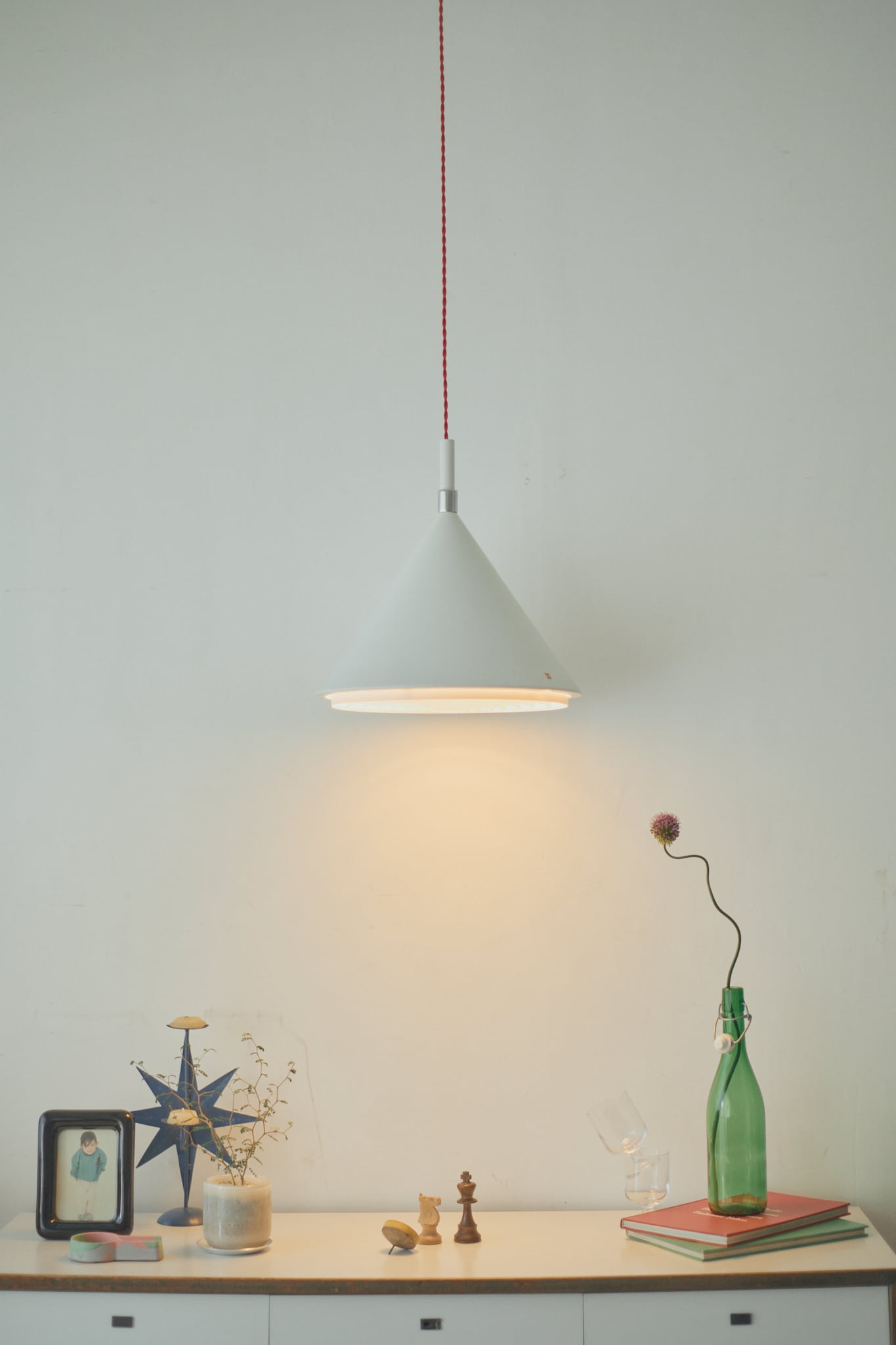 入荷時はまだ配線がされていないデッドストックの状態でした。梱包されていた箱は傷みがあり廃棄しましたが、コンディションは非常に良いもので、シェードに僅かな打ち跡があるものの、60-70年代頃の個体とは思えないほど綺麗な状態です。電気コードは赤い捻線のものに交換済みで、清潔にお使いいただけます。